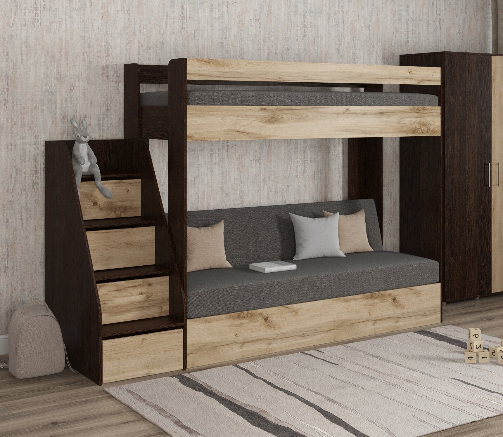 Кровать двухъярусная с диваном и лестницей-комодом Есэндвич Лаворо (Анкор темный/Анкор светлый/Savana Hazel) 56 890 ₽