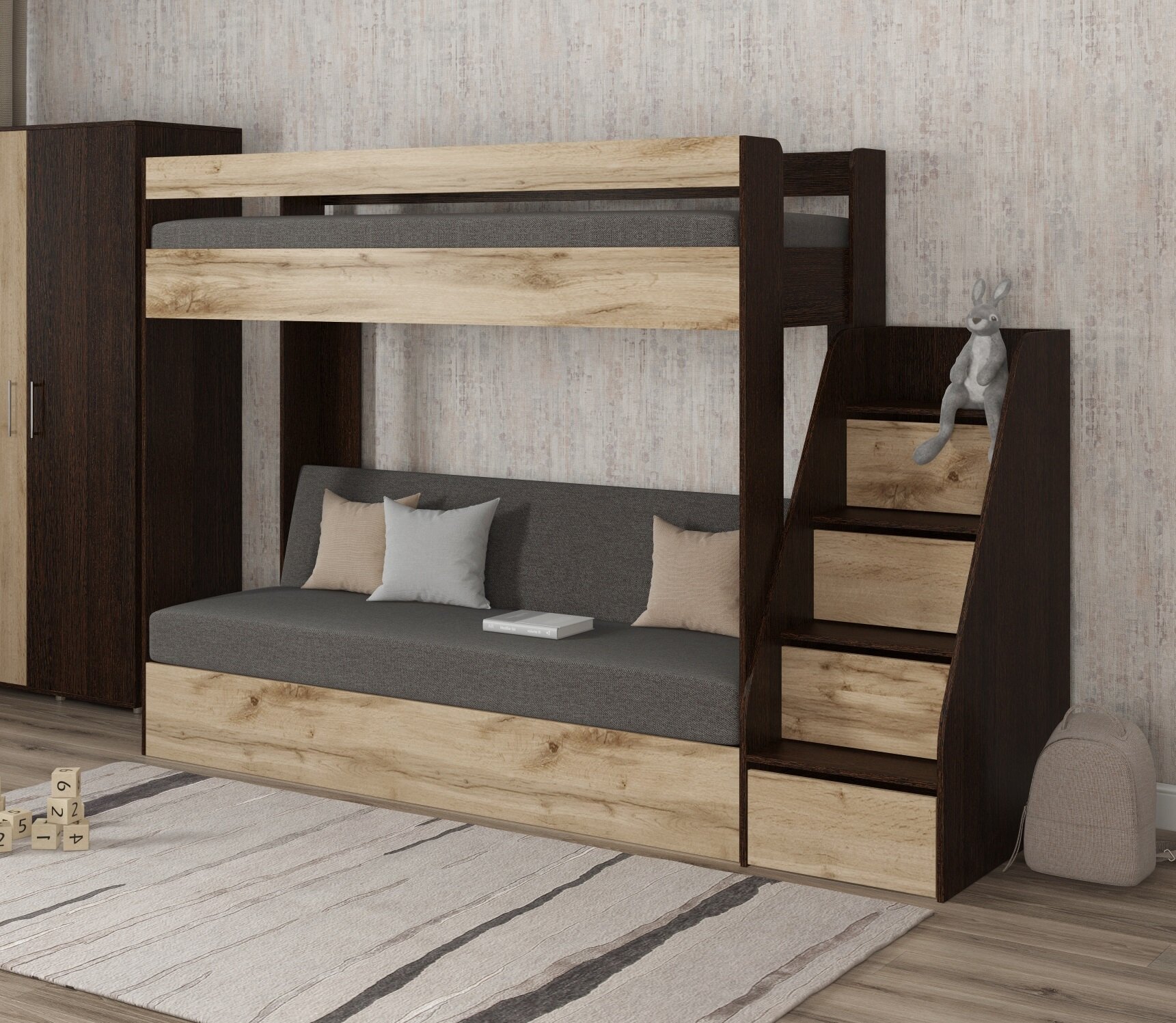 Кровать двухъярусная с диваном Есэндвич Лаворо (Венге/Дуб вотан/Savana Grey) 42 390 ₽