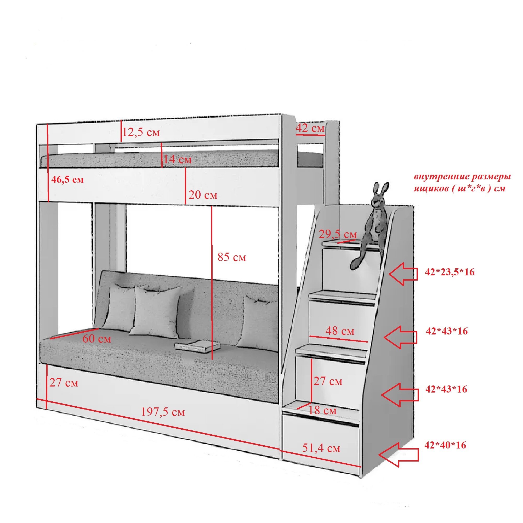 Отзывы на Кровать двухъярусная с диваном и лестницей-комодом Есэндвич Лаворо (Анкор белый/Бетон пайн экзотик/Savana Latte)