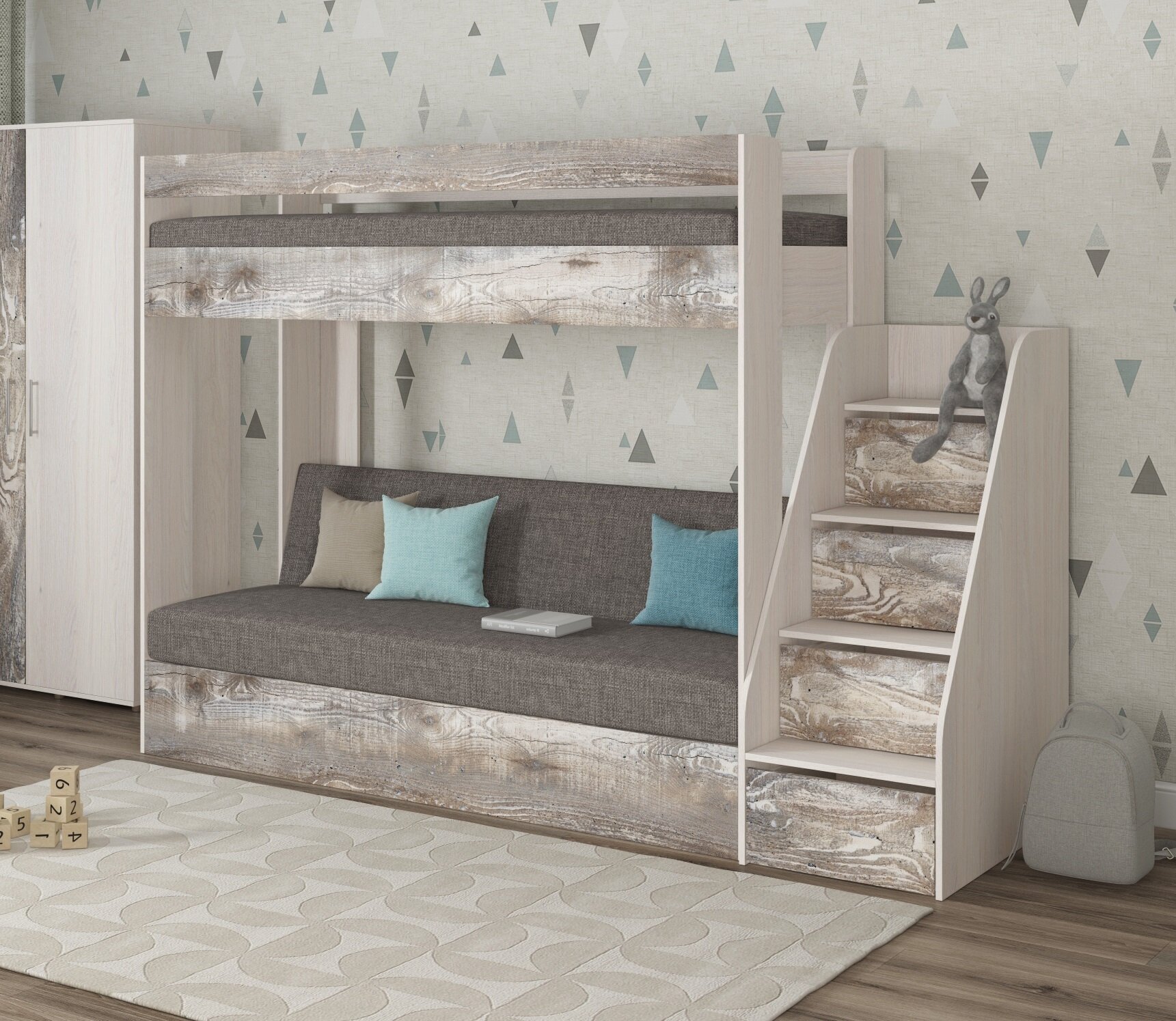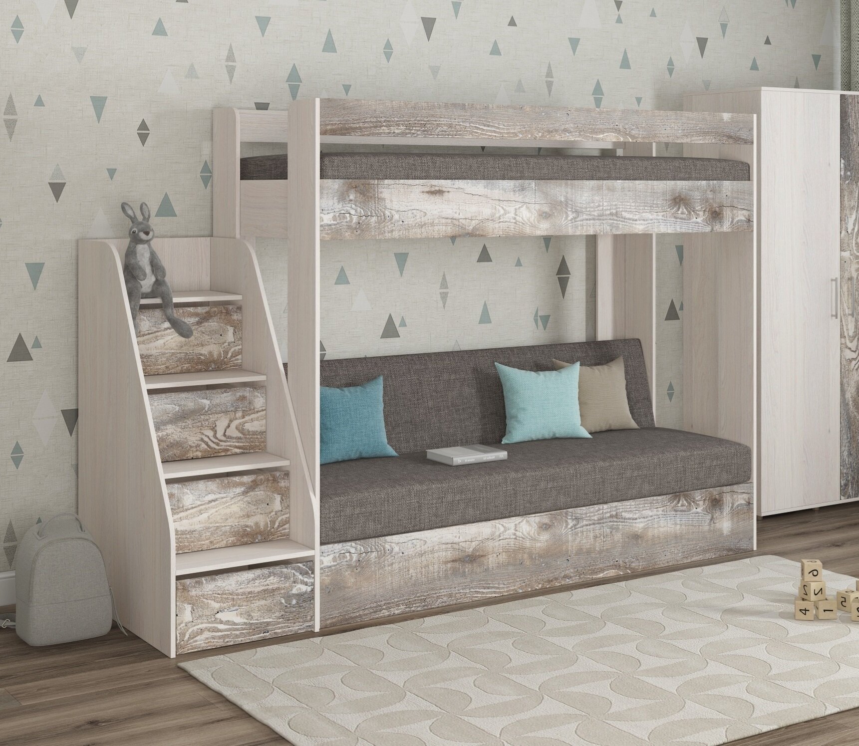 Кровать двухъярусная с диваном Есэндвич Лаворо (Сосна винтерберг/Savana Grey) 42 390 ₽