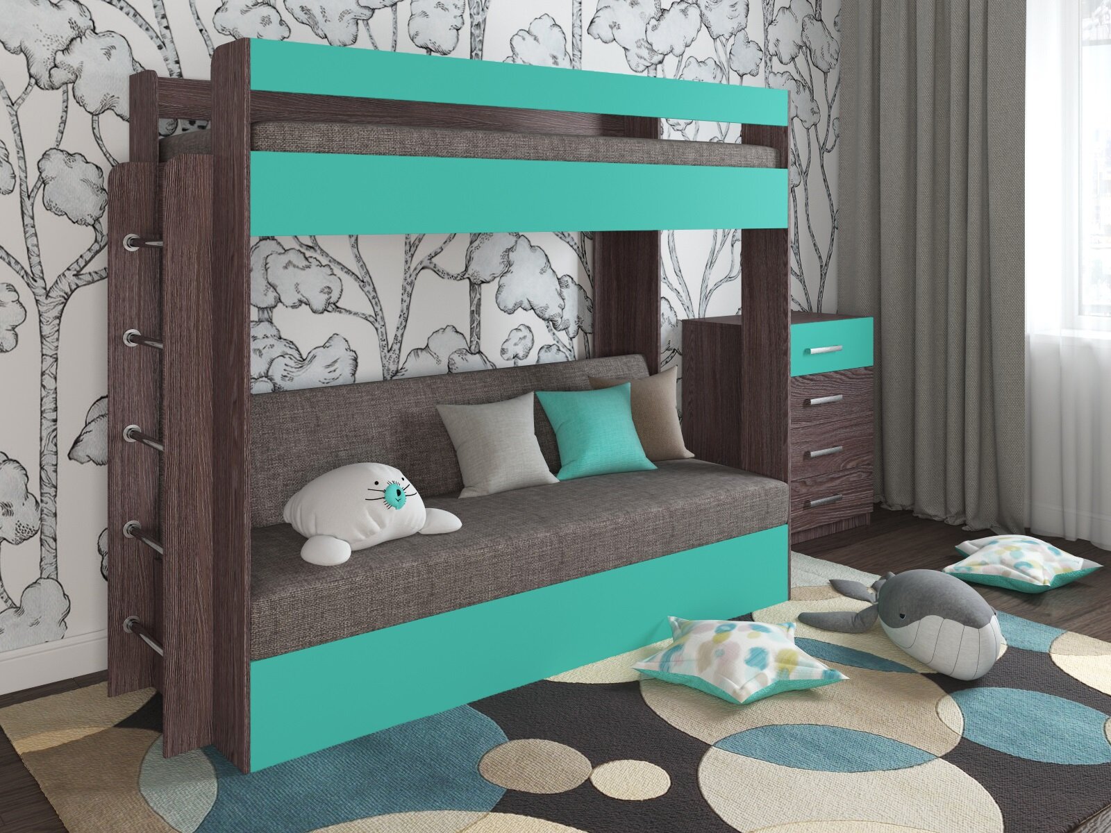 Кровать двухъярусная с диваном Есэндвич Лаворо (Анкор темный/Аква/Savana Latte) информация: