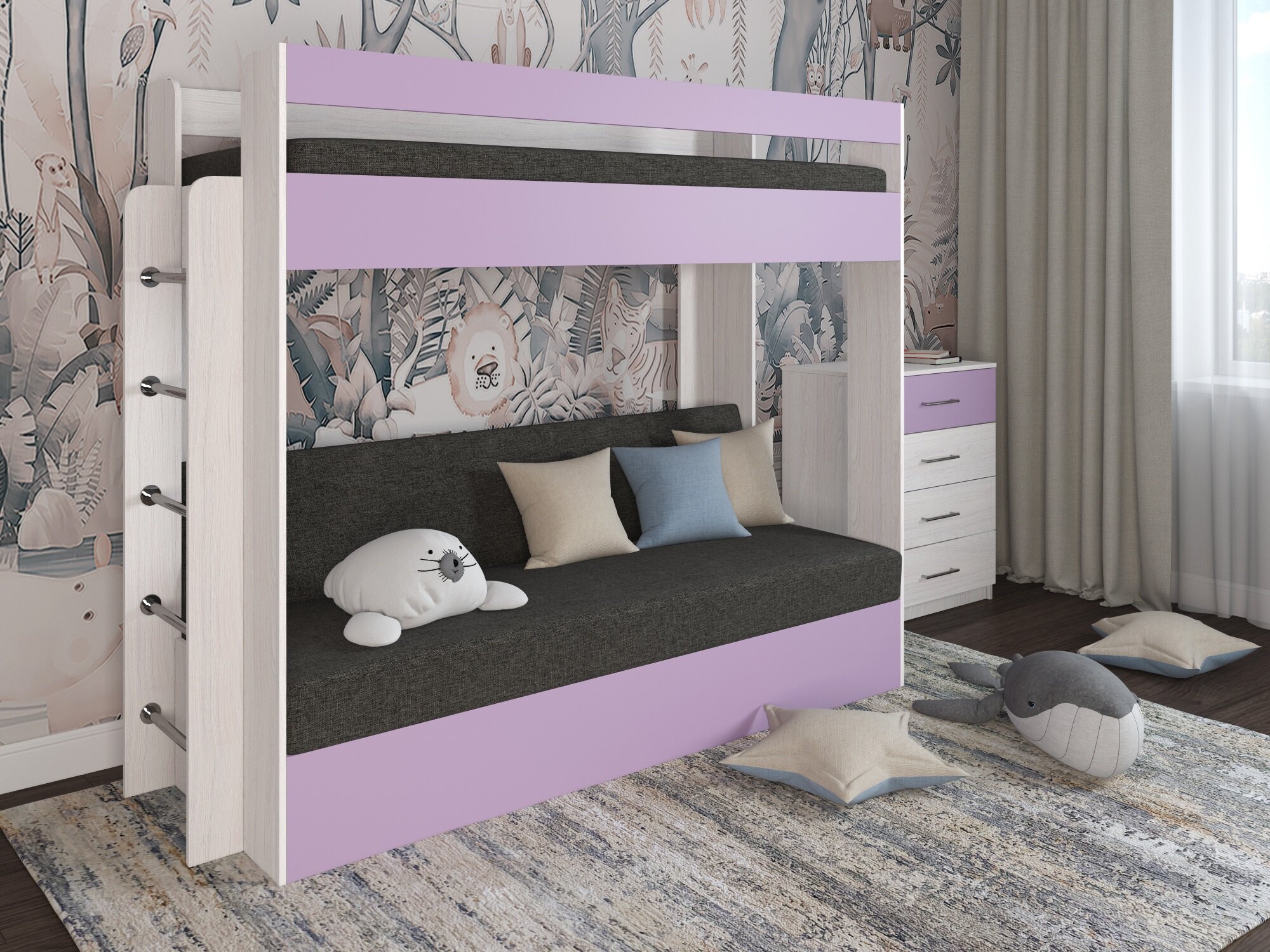 Кровать двухъярусная с диваном Есэндвич new Лаворо (Анкор белый/Ирис/Savana Grey) информация: