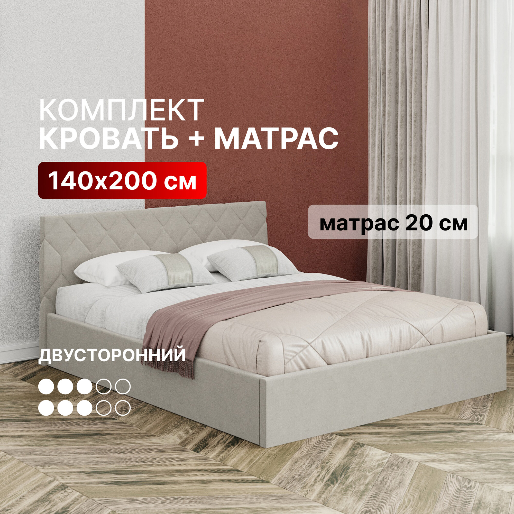 Кровать 140х200 с матрасом с подъемным механизмом двуспальная Техас и ящиком для белья, велюр с светло-бежевый информация: