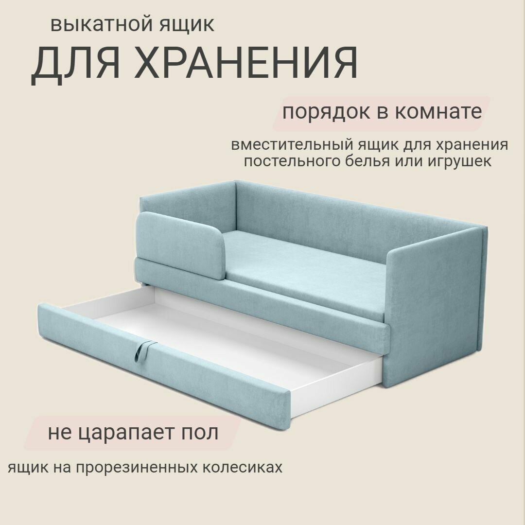 10 цен на Детский диван-кровать Майя 160х80 см голубой с выкатным ящиком и бортиком Кровать детская от 2х лет Без матраса