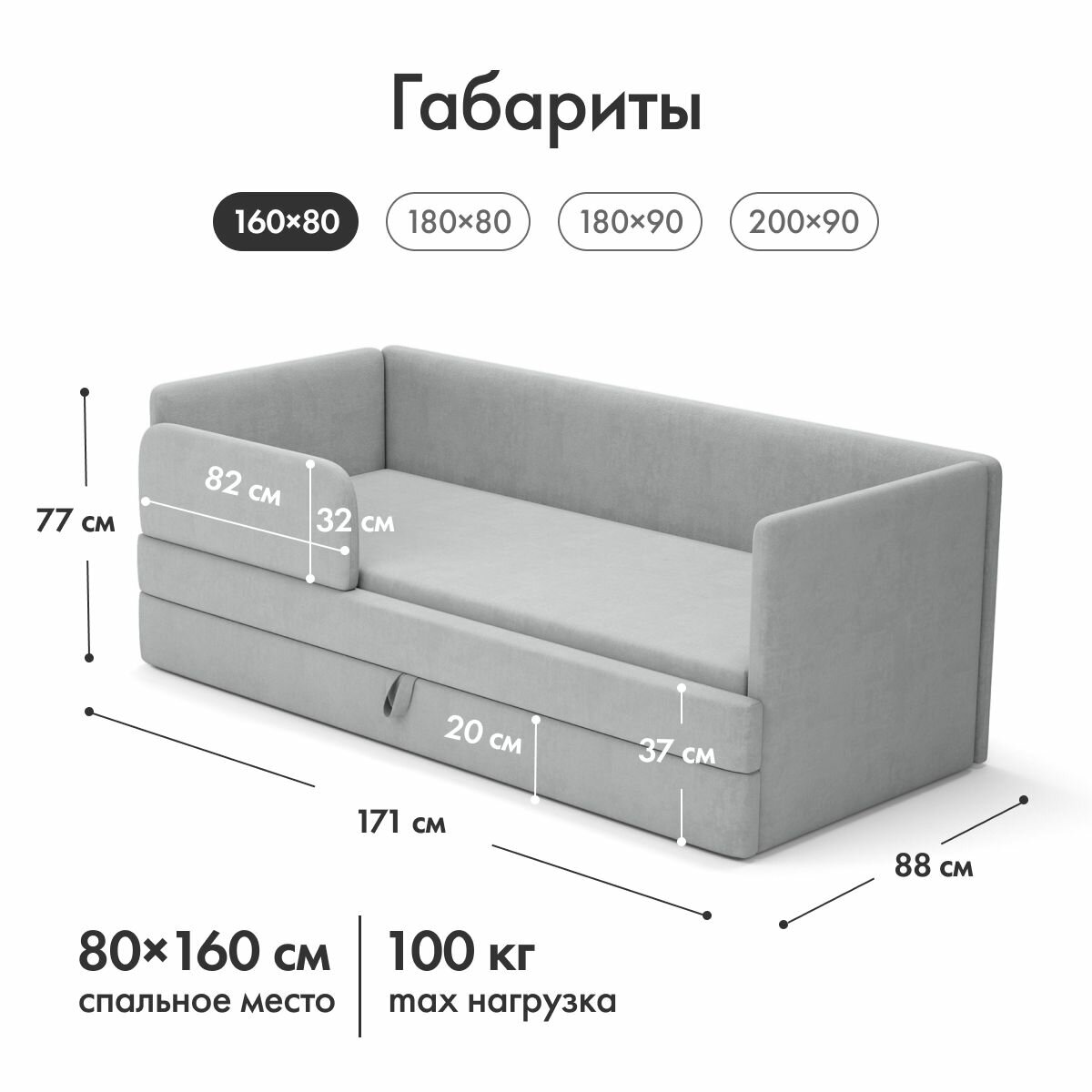 Детский диван-кровать Майя 160х80 см серый с выкатным ящиком и бортиком Кровать детская от 2х лет Без матраса информация: