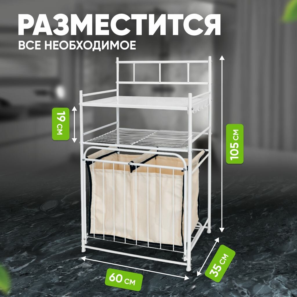 Стеллаж металлический с корзиной для белья напольный, Solmax&Home 2-х ярусный с полками, белый информация: