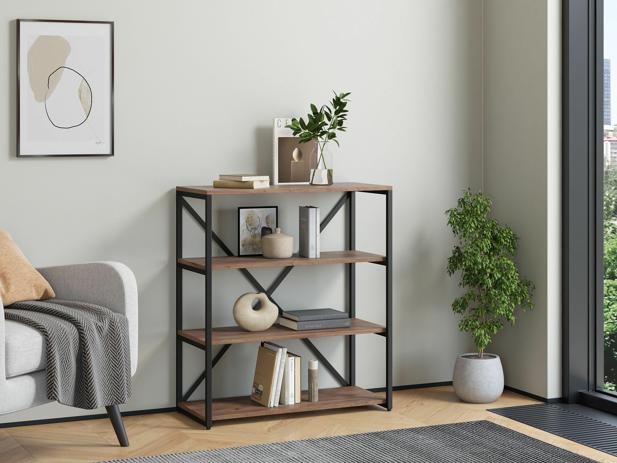 Стеллаж Айсберг Лофт 80/4 / Черный/ с полками дуб крафт табак/ Для дачи/ для дома/ для книг/ в офис информация: