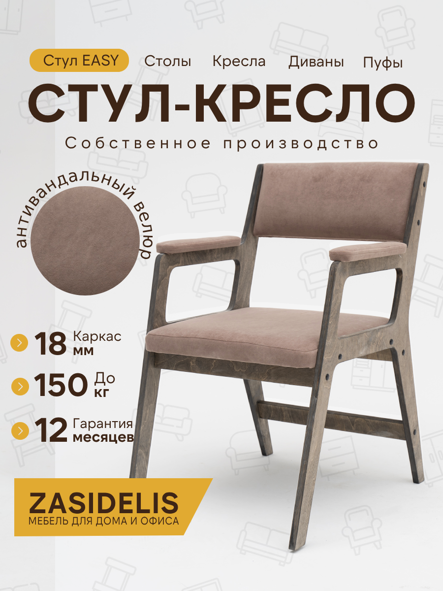 Стул ZASIDELIS Easy, велюр, антивандальный, с подлокотниками, коричневый, для кухни и офиса 8 000 ₽