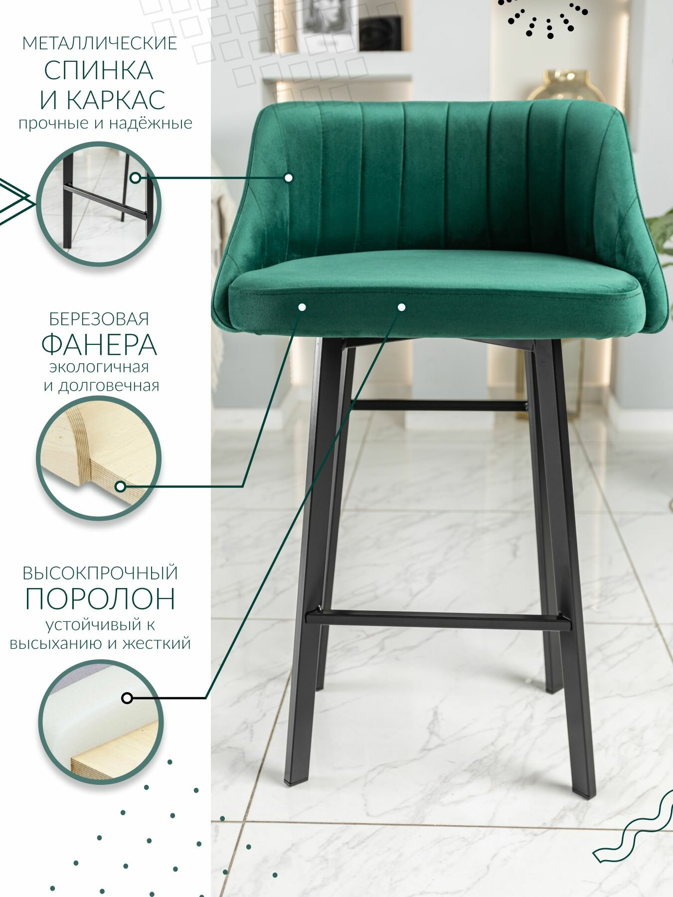 Барный стул со спинкой 2 шт. комплект цвет изумрудный информация: