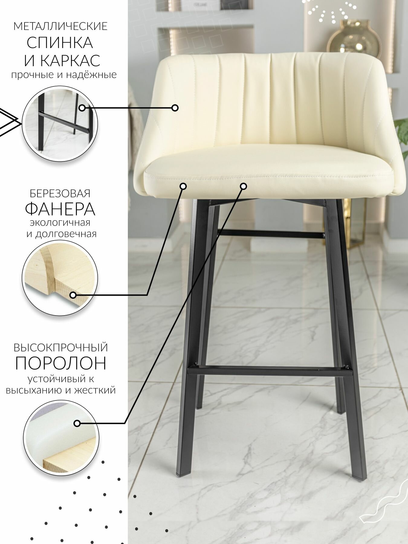 Барный стул со спинкой 2 шт. комплект цвет молочный кожзам информация: