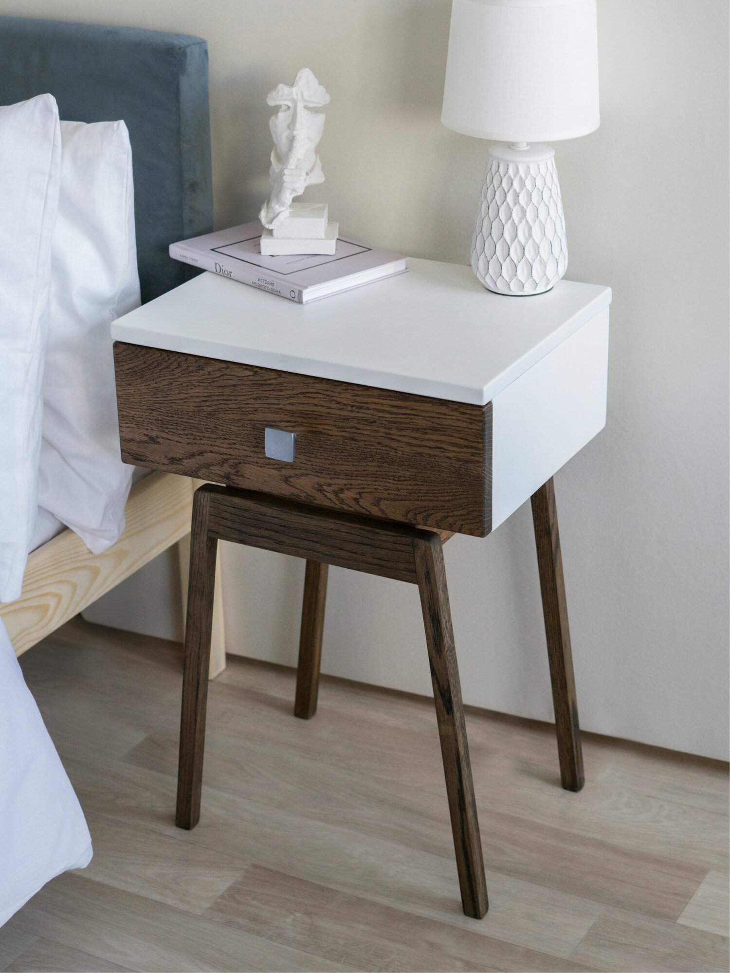 10 цен на Тумба прикроватная Hugo из натурального дерева. Высота 50 см. Парящий корпус 30х39х15 см. Цвет: эбен, белый.