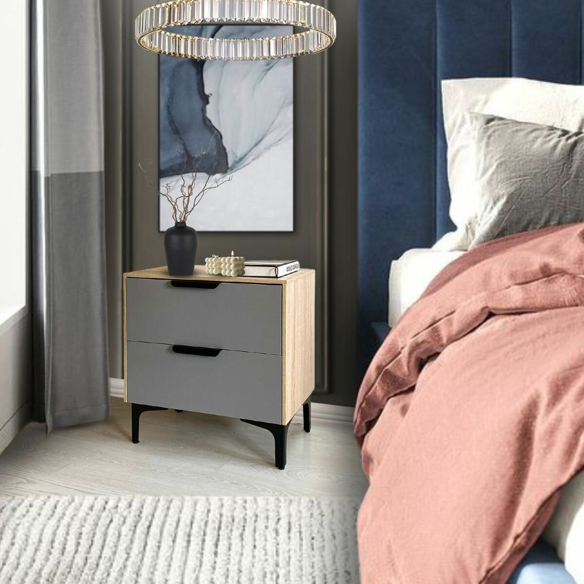 Прикроватная тумба на ножках с ящиками цвет комбинированный светлое дерево и серый, 49 см информация: