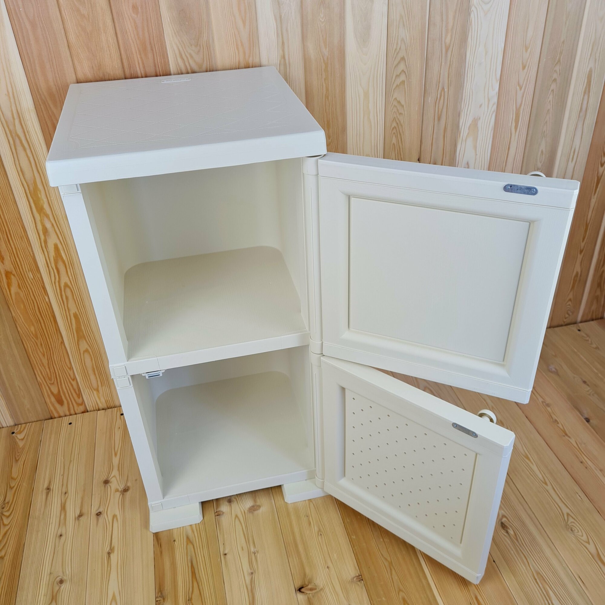 Тумба-шкаф пластиковая "УЮТ", с усиленными рёбрами жёсткости, две дверцы (верхняя сплошная, нижняя плетение). Цвет: Бежевый (Слоновая кость).