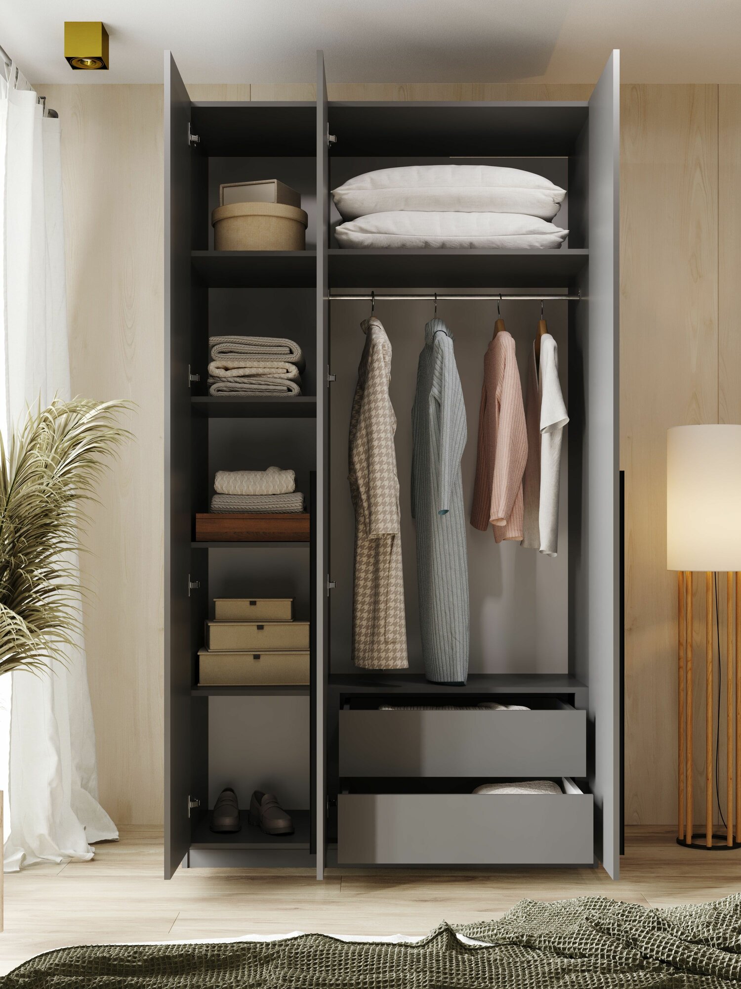 Отзывы на Шкаф для одежды 3-х дверный, с полками, шкаф с ящиками для детской, скрытое хранение, Графит, 2200х1200х520 мм