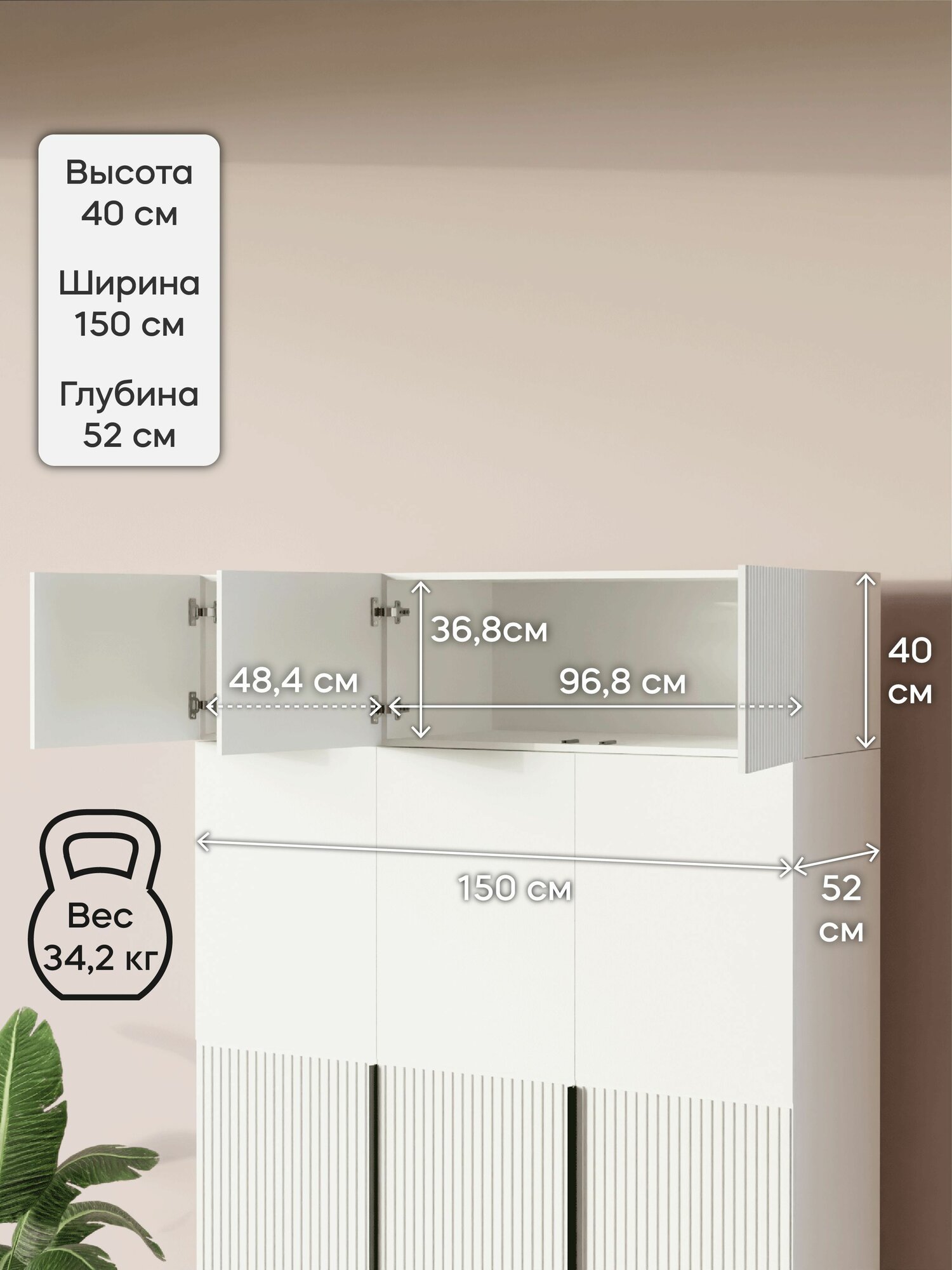 Антресоль LAERA, МДФ, ЛДСП, 150 см x 52 см x 40 см, нажимная, белый лайт информация: