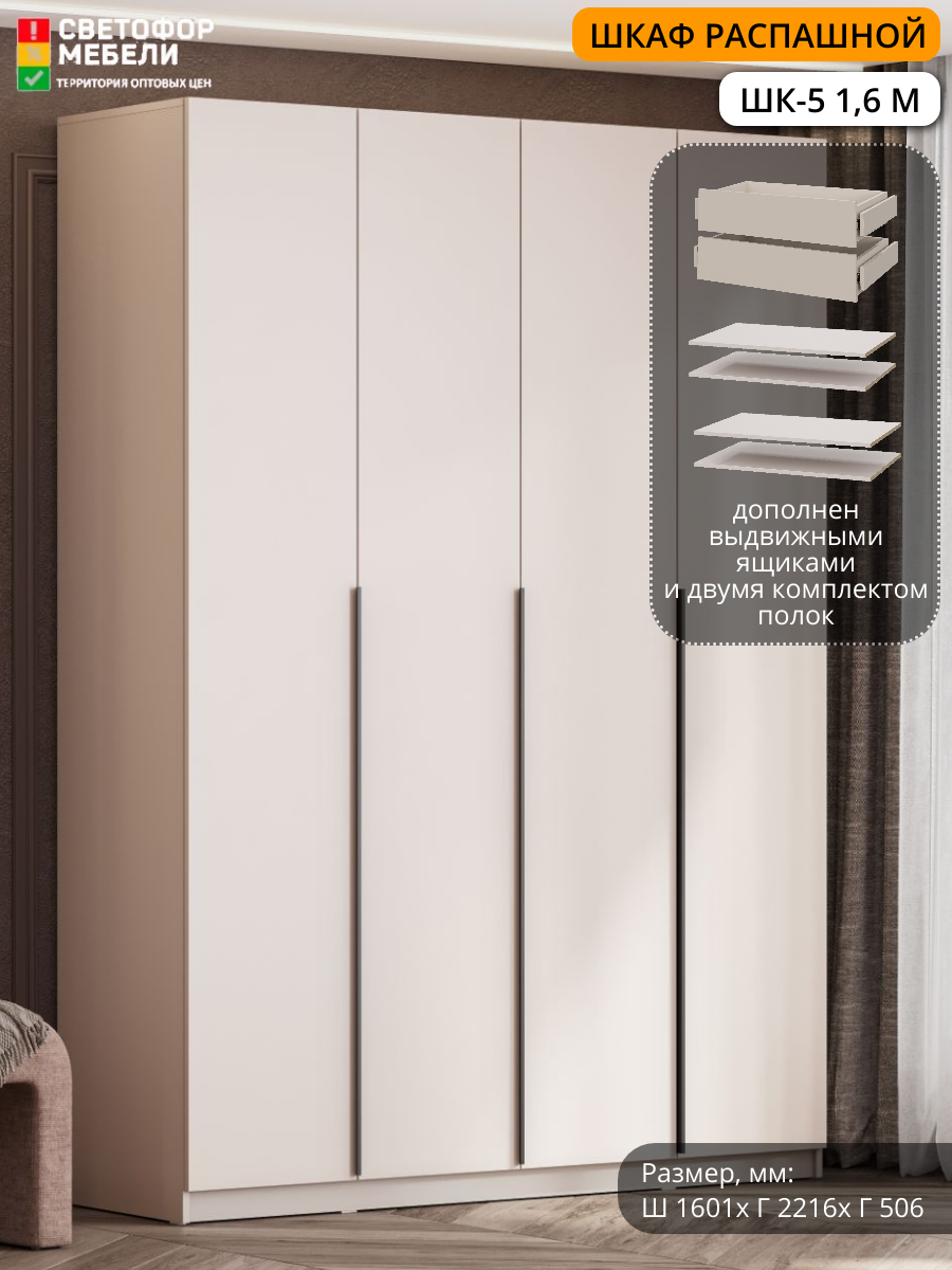 Шкаф распашной Мебельный рай ШК-5 1,6 1601х2216х506, Меланж, с двумя комплектами полок и ящиками информация: