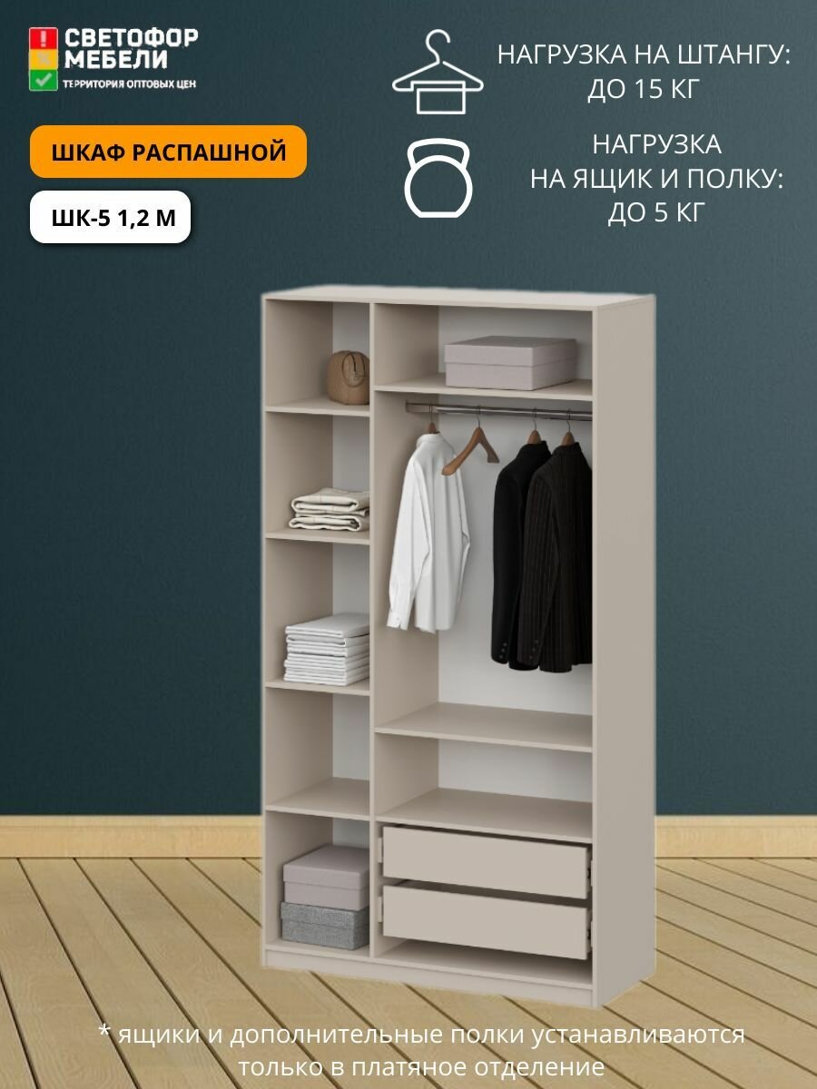 Шкаф распашной Мебельный рай ШК 5 1,2м 1201х2216х506, Меланж, с комплектом доп. полок и ящиками информация: