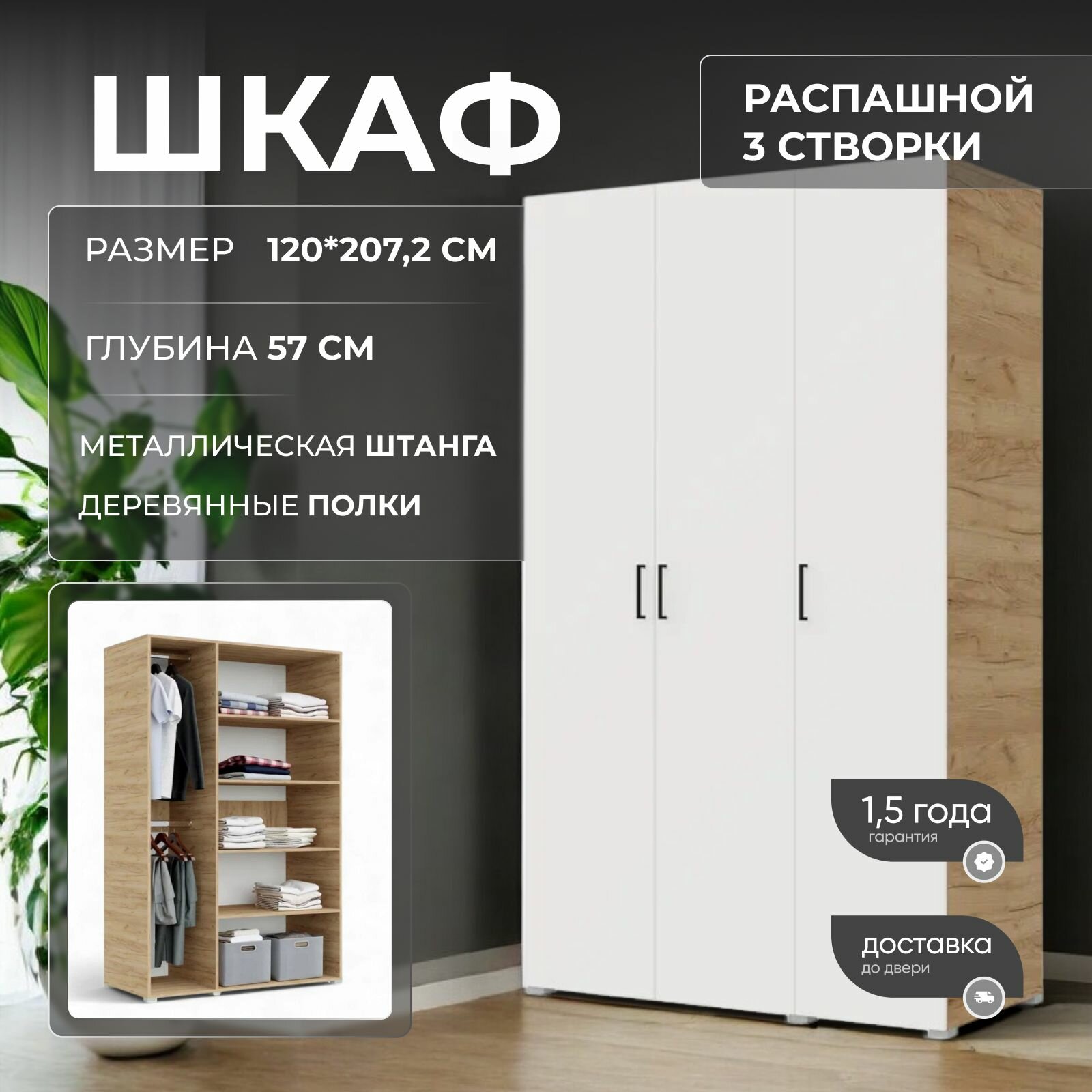 Шкаф распашной 3-х створчатый Бостон 120 Б с полками, крафт золотой/белый информация: