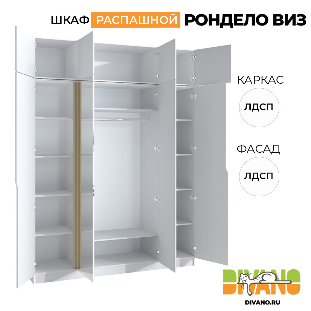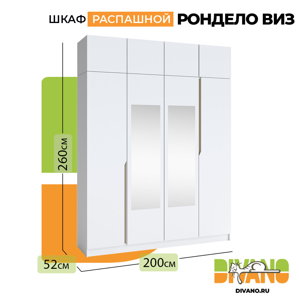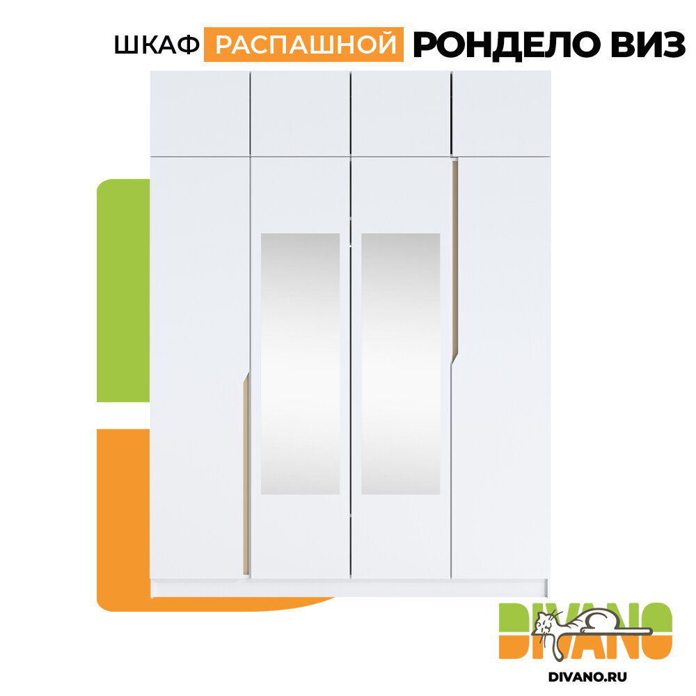 Шкаф распашной Рондело виз 4-х дверный с антресолью и 2-мя зеркалами 2.0 м (белый) информация: