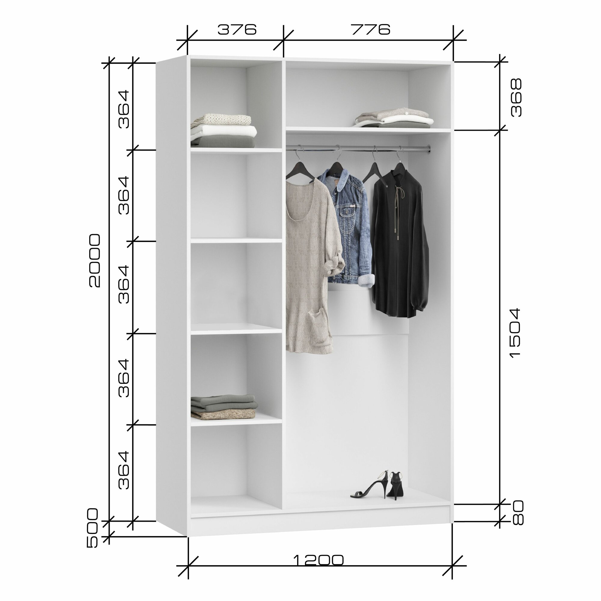 Шкаф для одежды распашной Нонтон Луас, 120 см, 7 полок и штанга, белый глянец