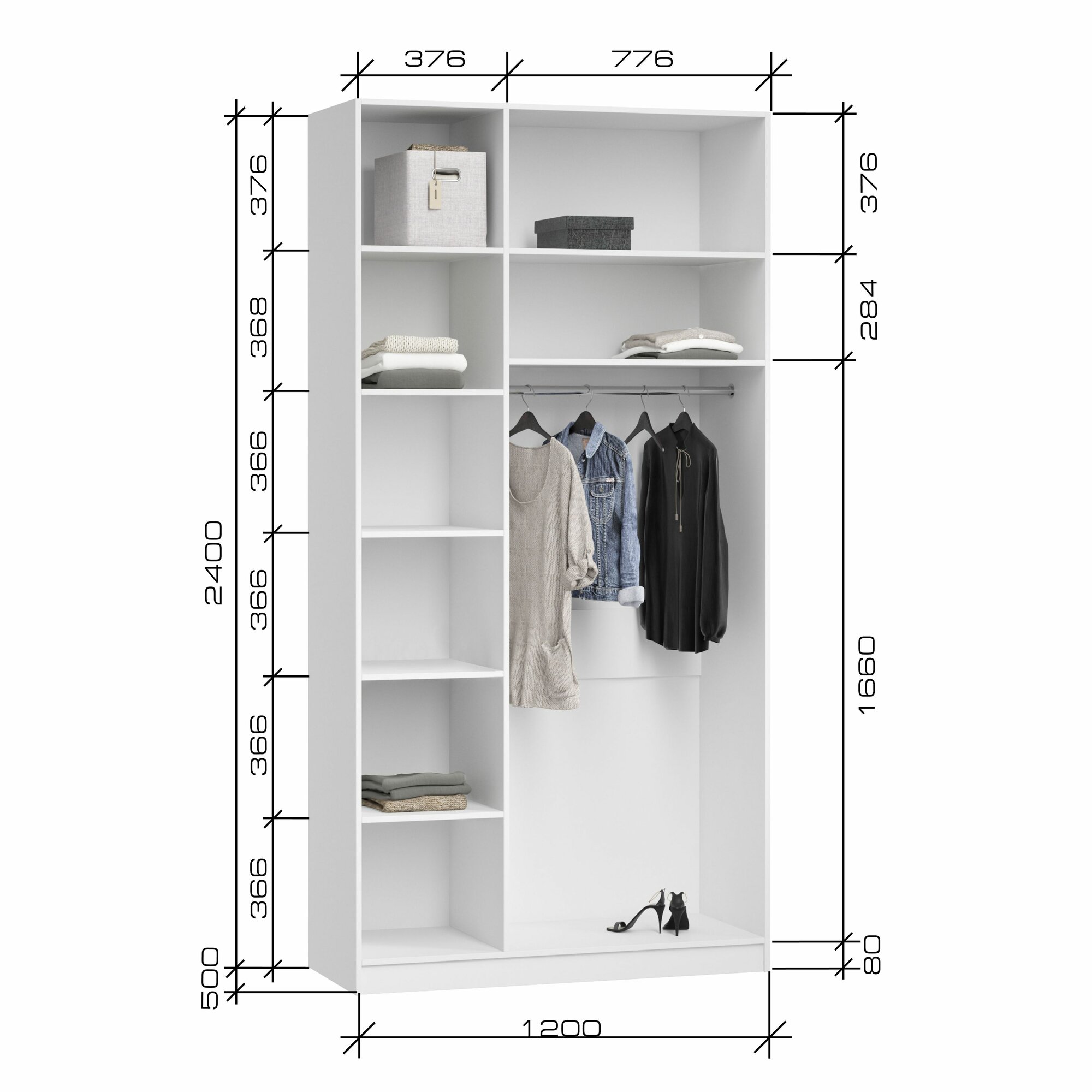 Шкаф для одежды распашной Нонтон Луас, 120 см, 7 полок и штанга, белый глянец