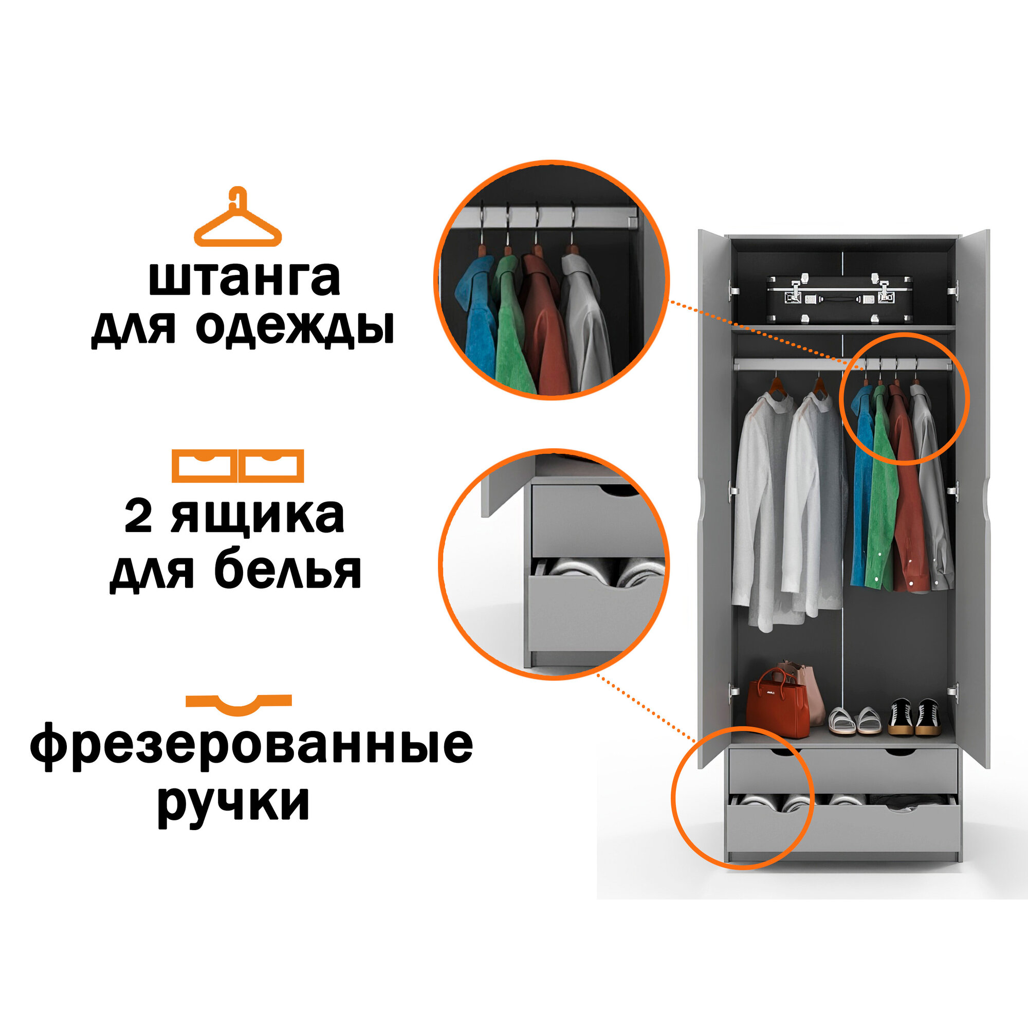 Шкаф двухстворчатый распашной, с ящиками, со штангой Grand 5 Лаворо 80x55х210 см (Анкор белый/Базальт) 21 290 ₽