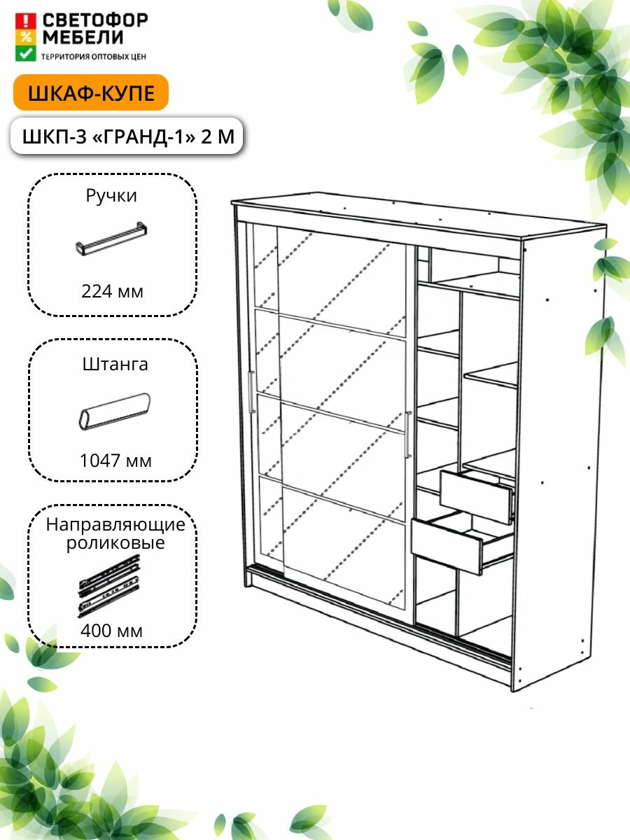 Шкаф-купе Мебельный рай ШКП 3 Гранд 1 без зеркал 2002х2200х615, Белый гладкий/Графит/Лакобель белый информация: