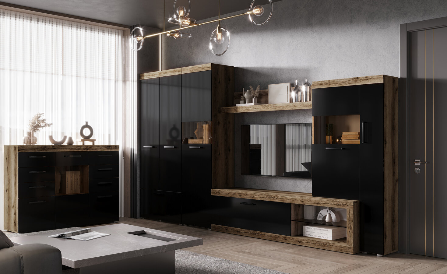 Шкаф распашной с выдвижным ящиком Бастон 0.9 Эра Дуб Вотан / Чёрный гладкий 10 600 ₽