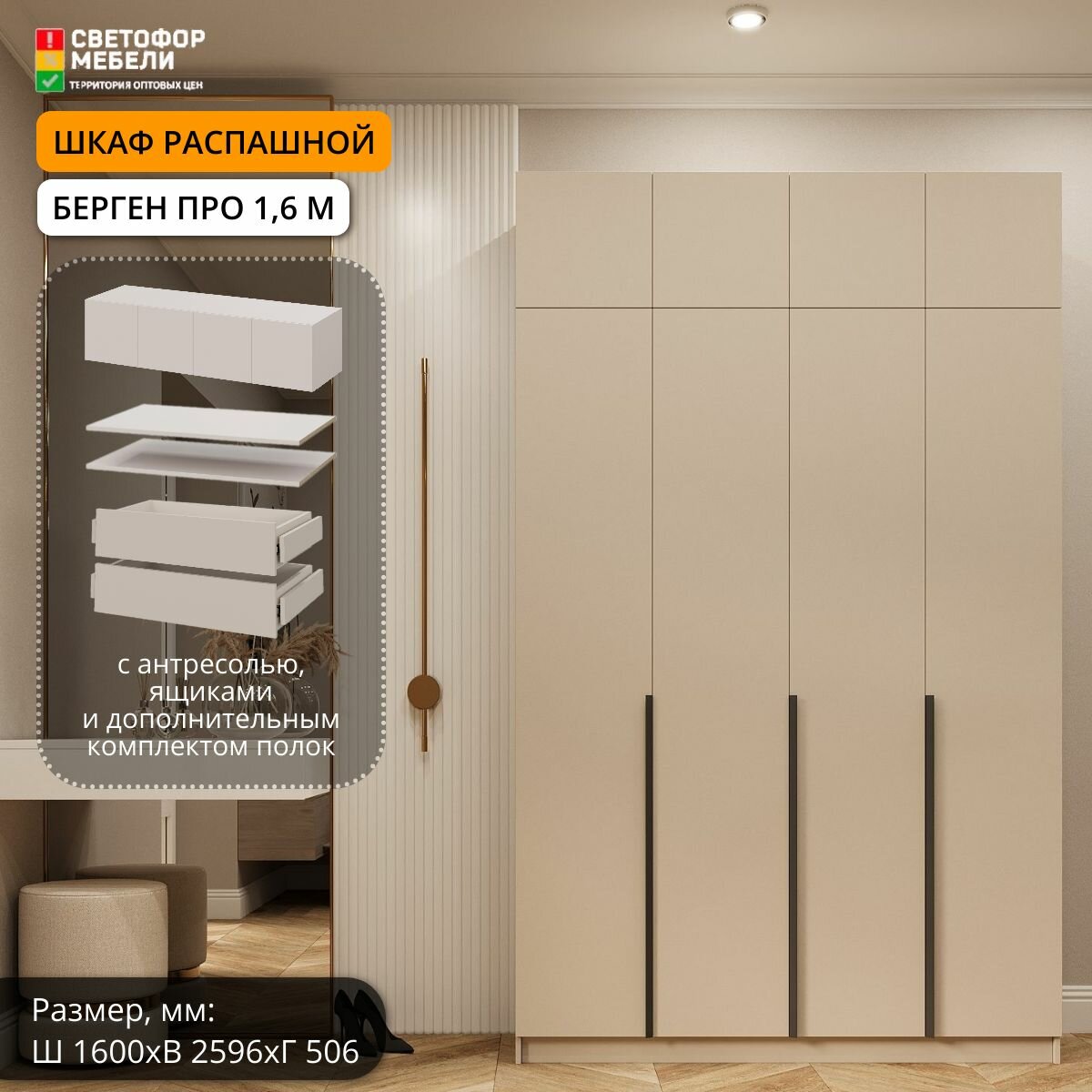 Шкаф распашной Мебельный рай Берген Про 1.6 м с антресолью, штангой, ящиками и полками 1600х2596х506, Кашемир информация: