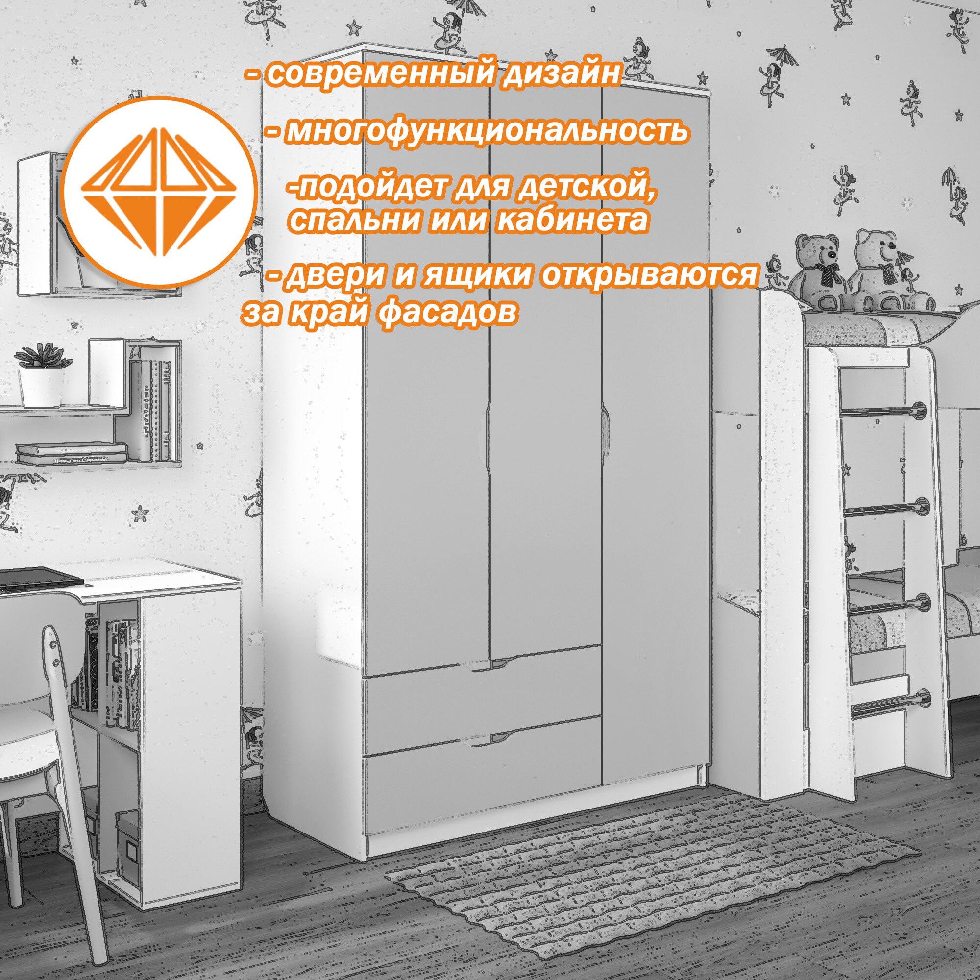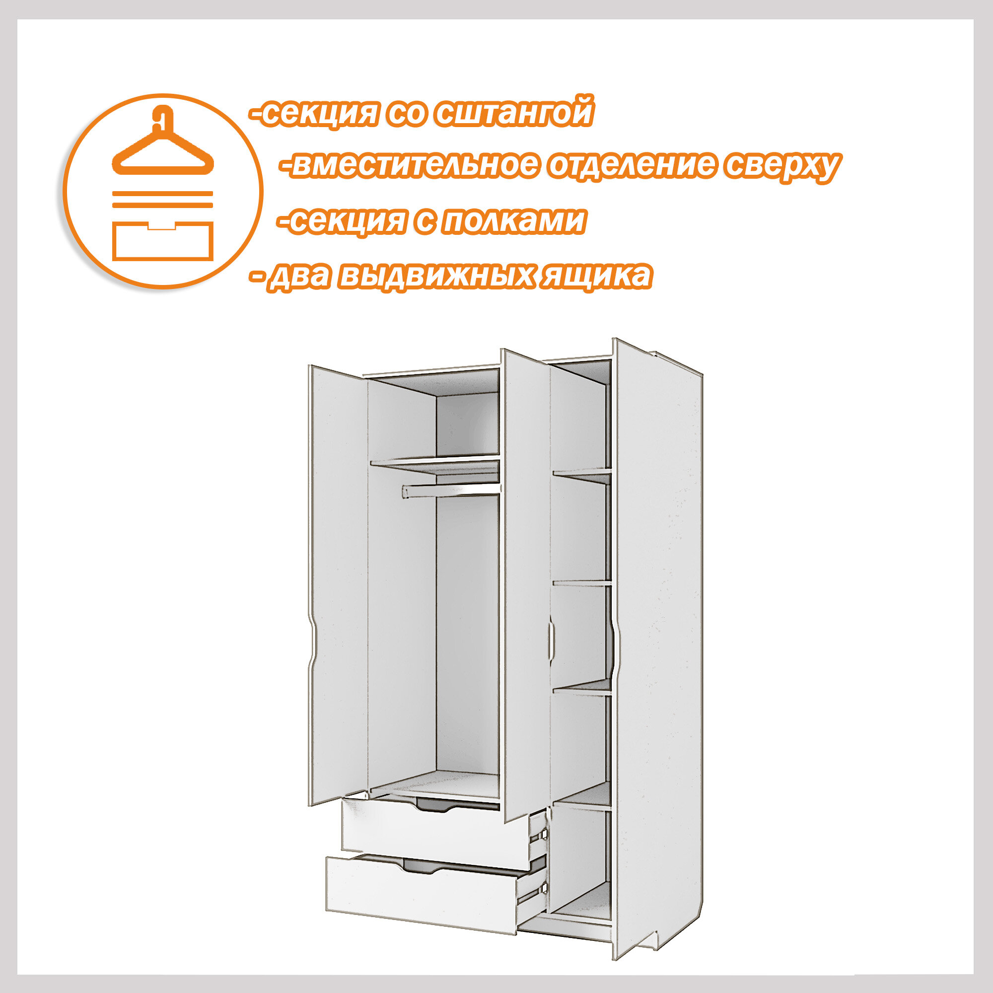 Шкаф трехдверный, с ящиками, со штангой Есэндвич Лаворо, правый 120x55х200 см (Анкор белый) 32 890 ₽