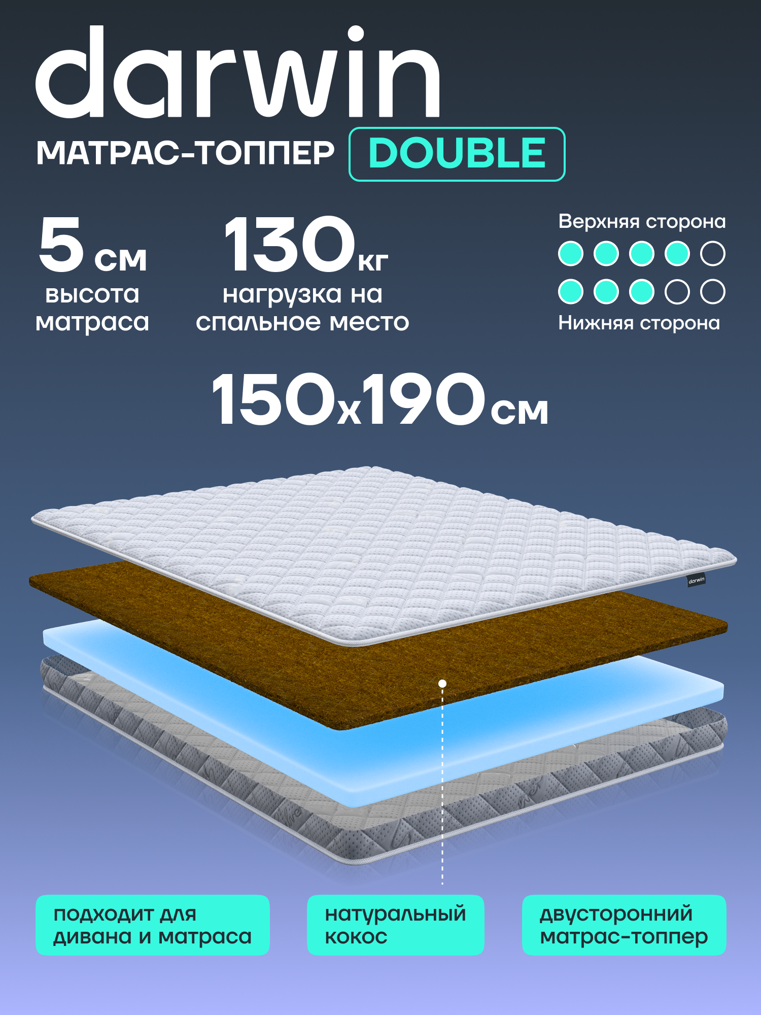 Матрас-топпер Darwin Double 150х190 см, с кокосовой койрой, двухсторонний с разной жесткостью сторон, высота 5 см информация:
