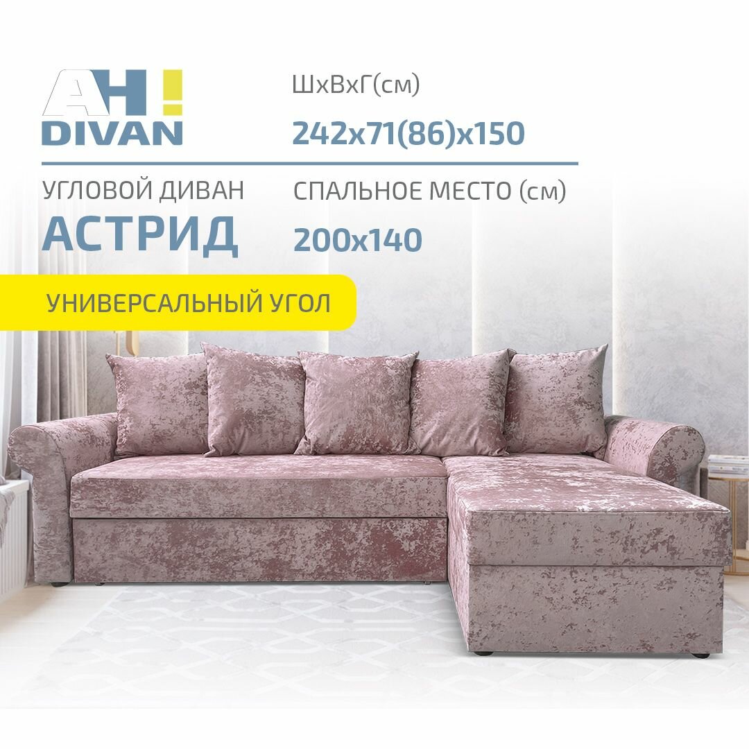 Угловой диван AH! DIVAN (АхДиван) Астрид 242х150х71, раскладной диван-кровать, механизм дельфин, розовый плюш информация: