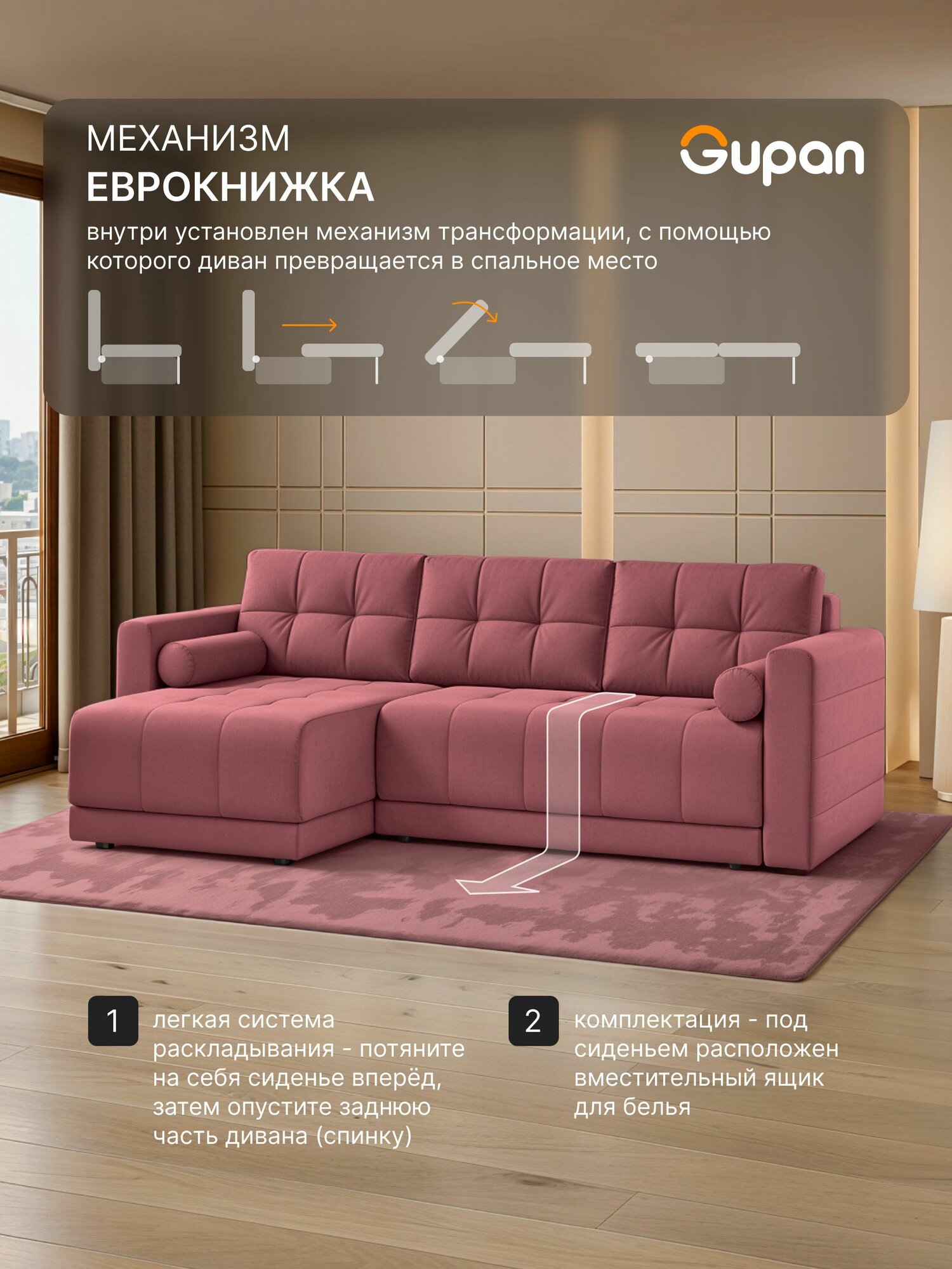 Отзывы на Диван угловой Gupan Скайти Велюр Amigo Berry, диван раскладной, механизм еврокнижка, беспружинный, с ящиком для белья