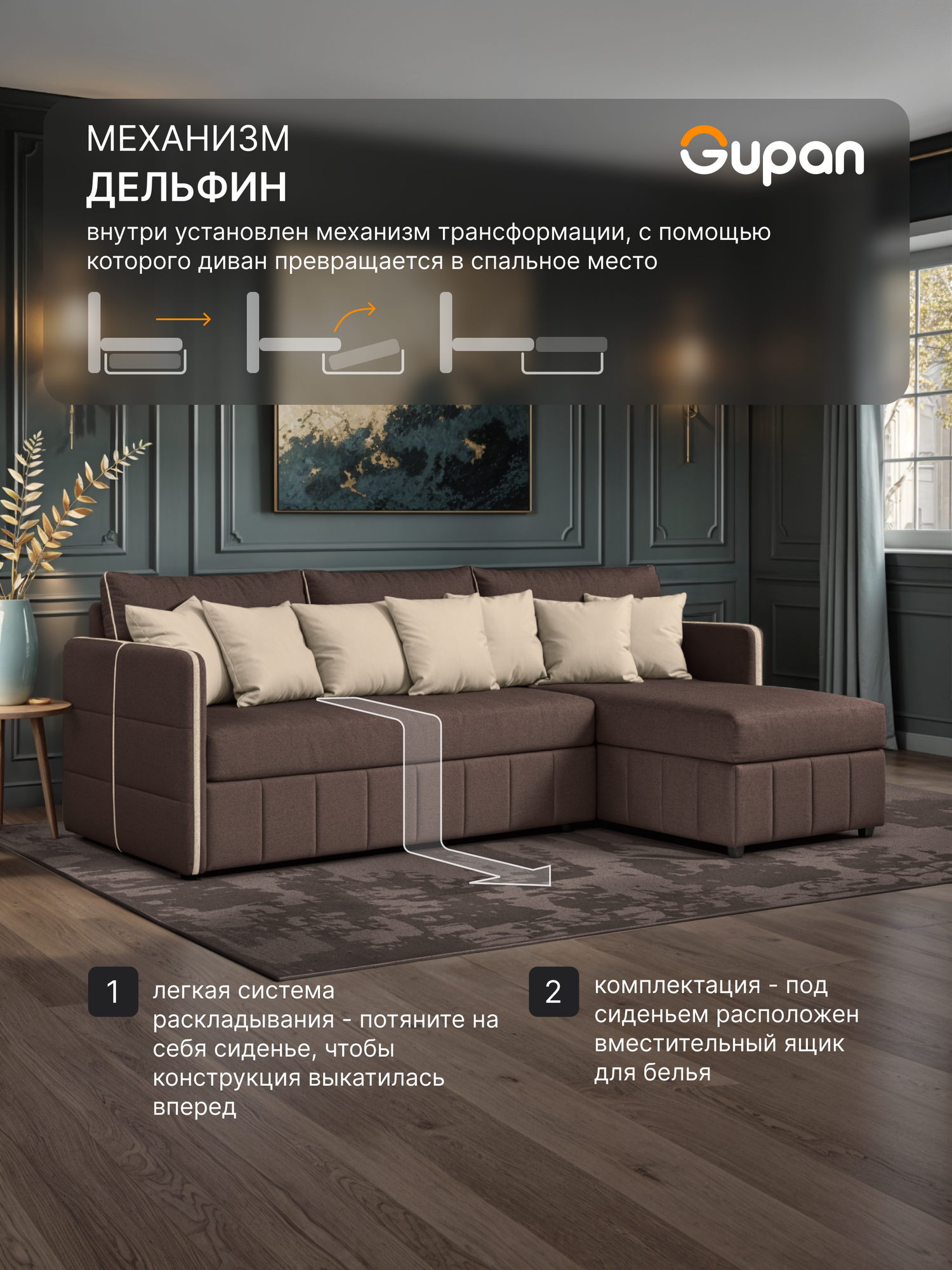 Отзывы на Диван угловой Gupan Граус Велюр Amigo Brown, раскладной, механизм дельфин, беспружинный, с ящиком для белья