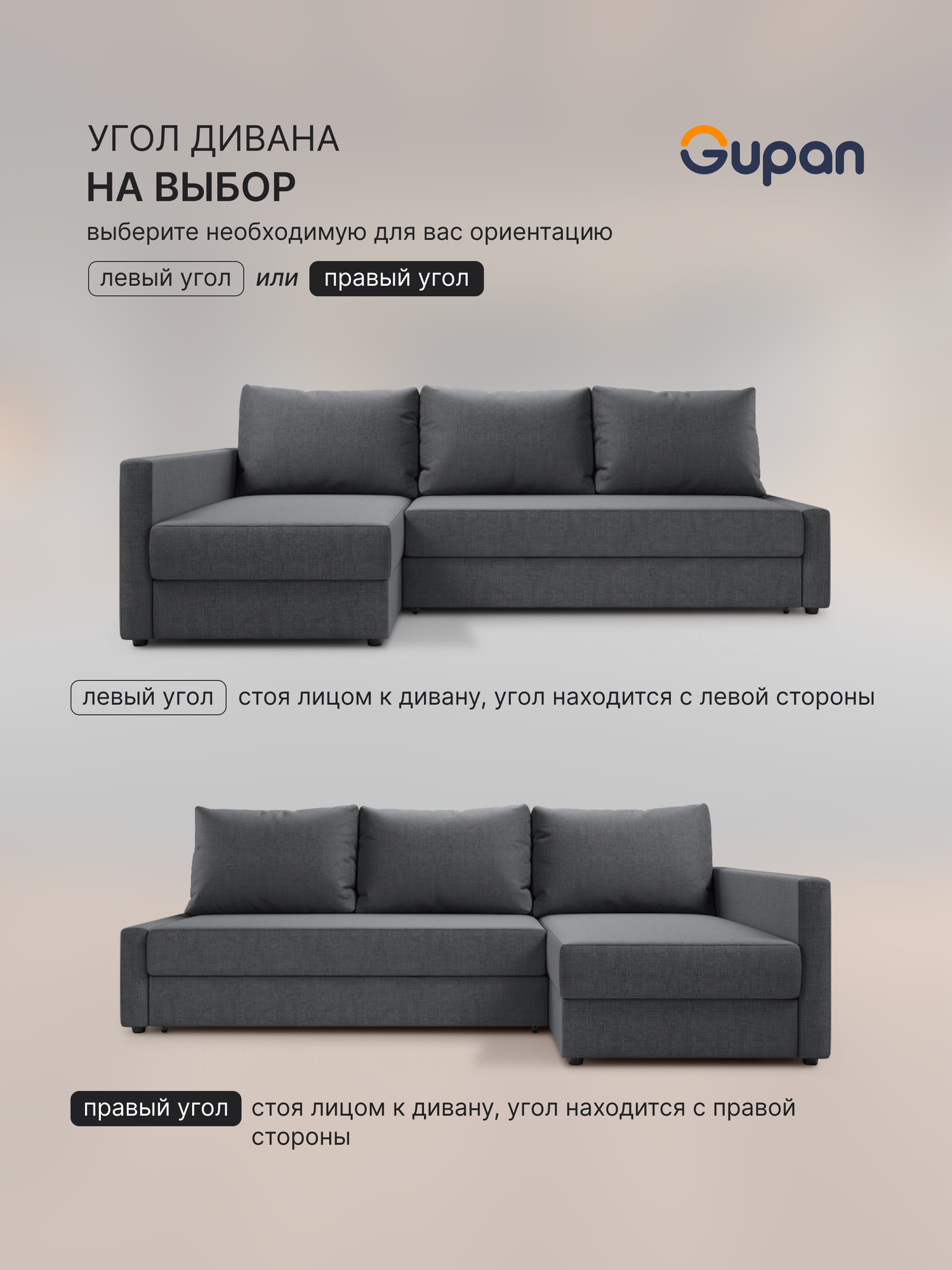 Диван угловой Gupan Фрисби Рогожка Savana Grafit, раскладной, механизм дельфин, беспружинный, с ящиком для белья информация: