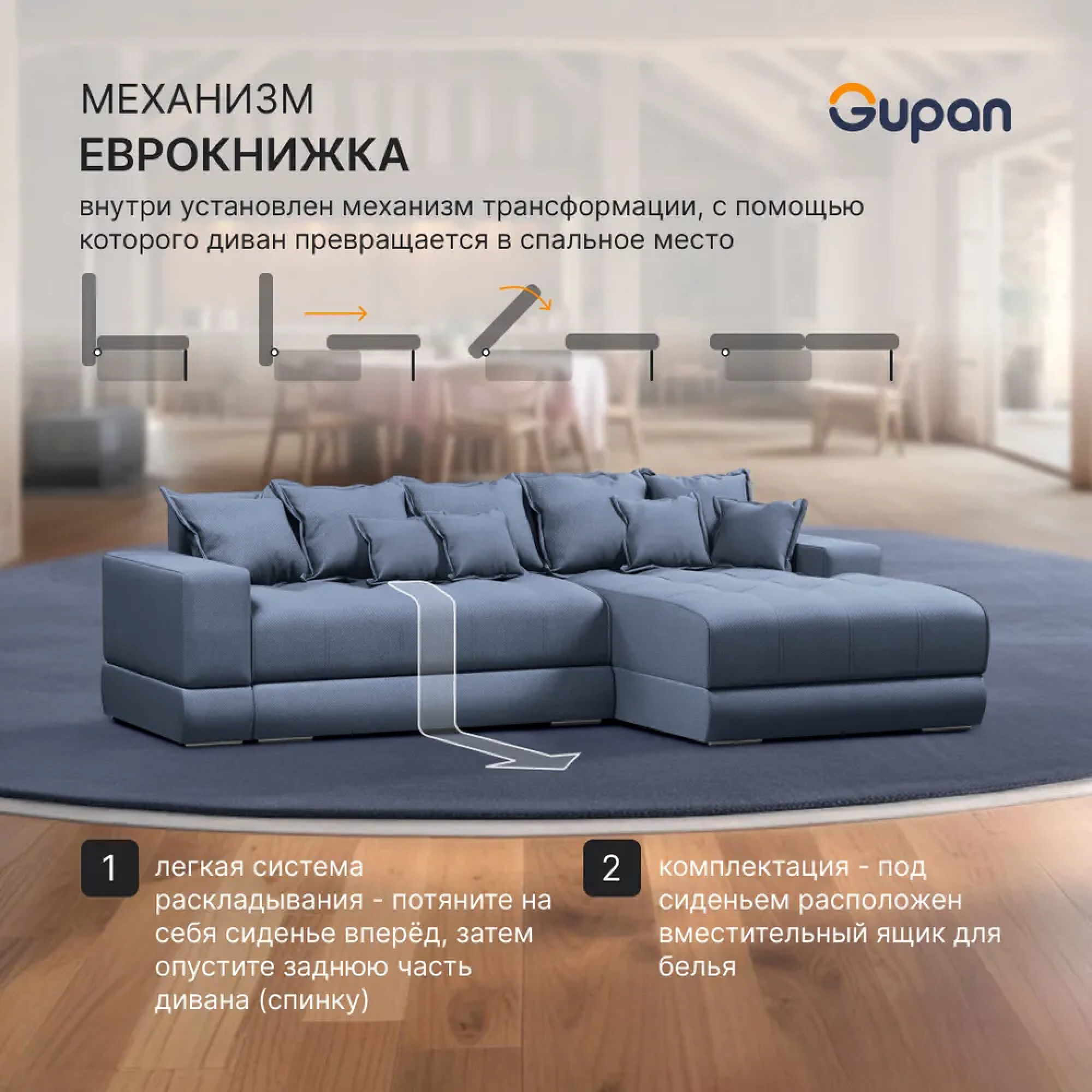 Отзывы на Диван угловой Gupan Olis Велюр Amigo Navy, раскладной, механизм еврокнижка, беспружинный, с ящиком для белья