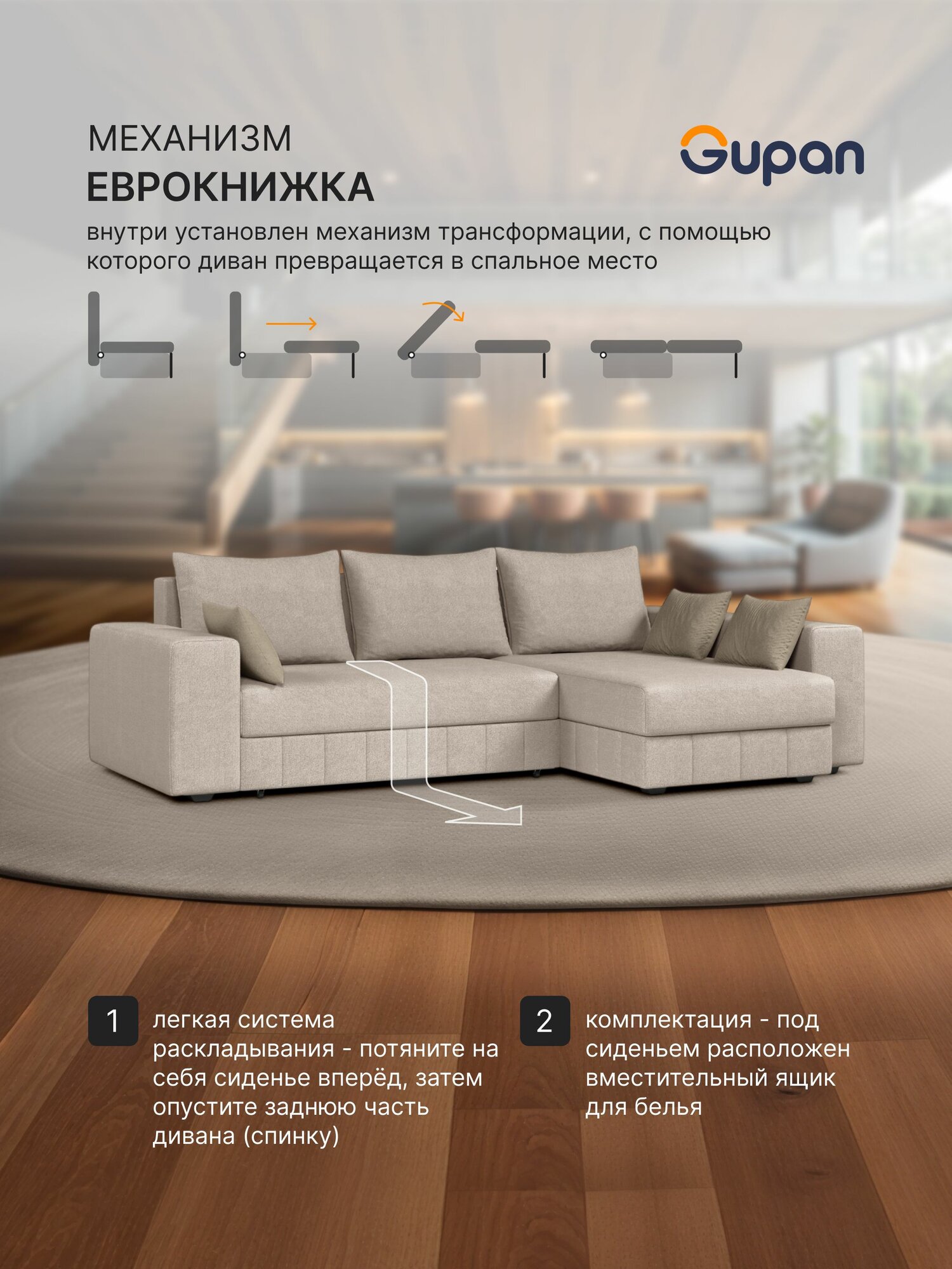 Отзывы на Диван угловой Gupan Майами Велюр Amigo Cream, раскладной, механизм еврокнижка, беспружинный, с ящиком для белья