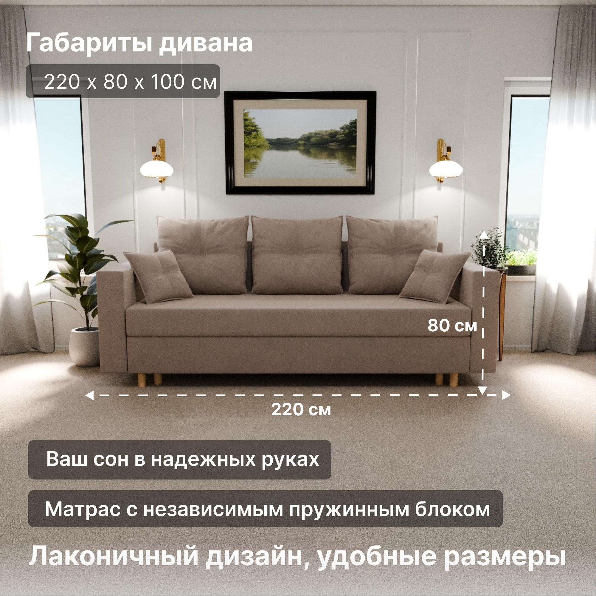 Диван раскладной, "Garmonia", НПБ, Велютта люкс 07 размеры 220х80х100, бежевый информация:
