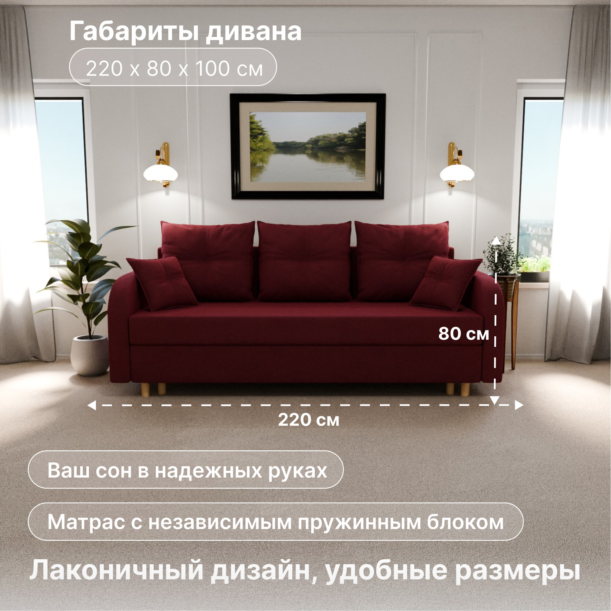 Диван раскладной, "Genri", НПБ, Велютта люкс 41 размеры 220х80х100, бордовый информация: