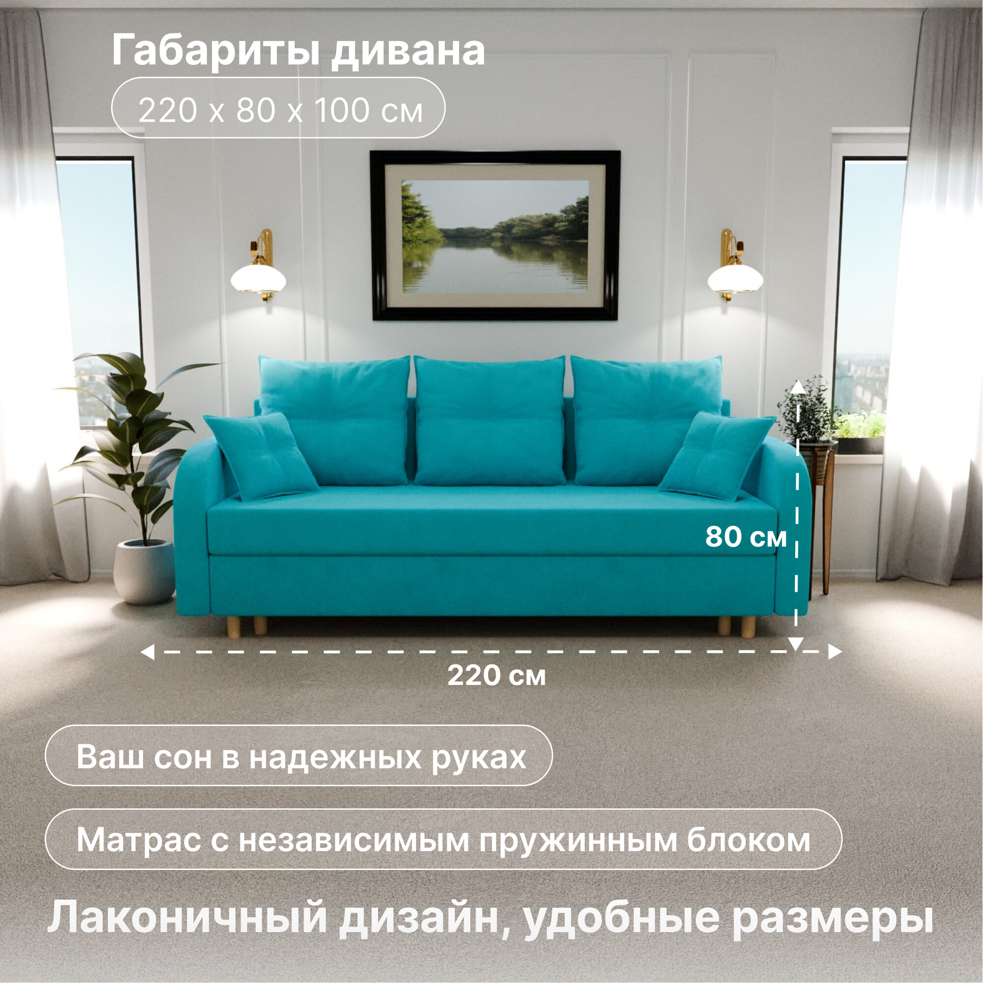 Отзывы на Диван раскладной, "Genri", НПБ, Велютта люкс 44 размеры 220х80х100, бирюзовый