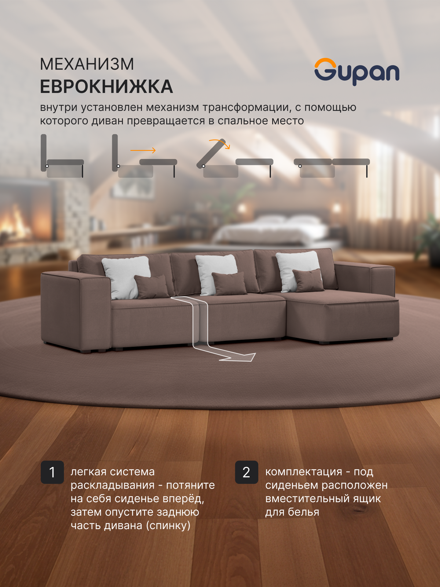 Диван угловой Gupan Фабио / Лофт Велюр Amigo Chocolate, раскладной, механизм еврокнижка, беспружинный, с ящиком для белья информация: