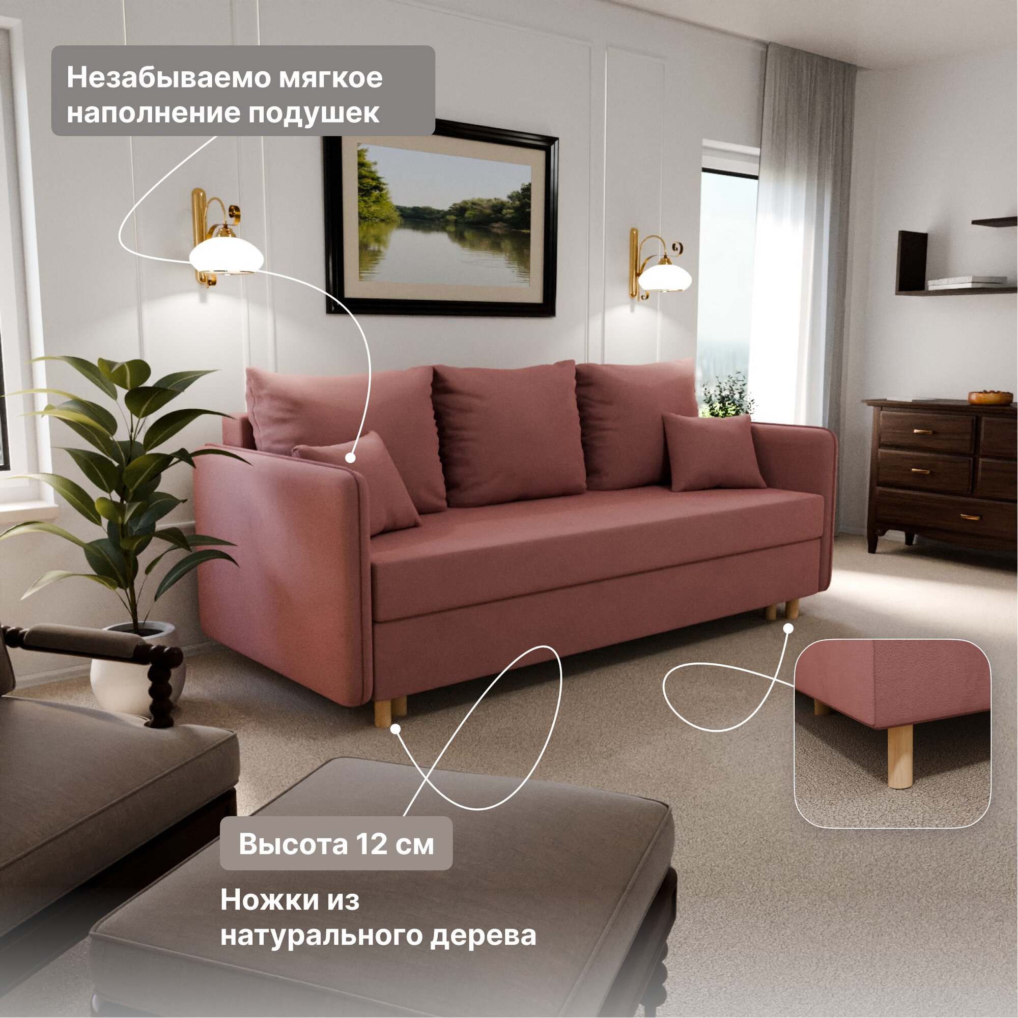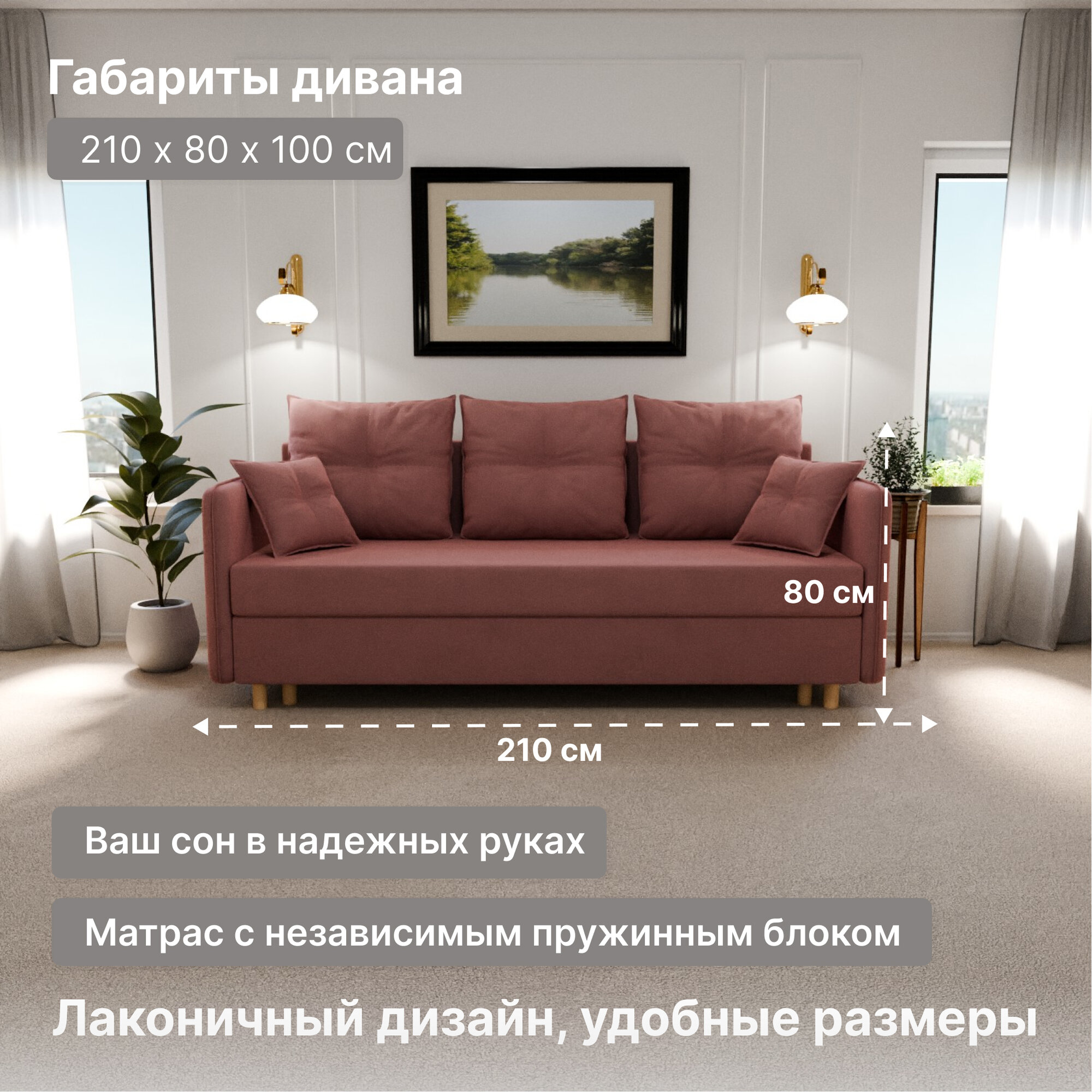 Диван, диван-кровать, диван раскладной "Лотос" НПБ, Велютта люкс 62, размеры 210х80х100, розовый информация:
