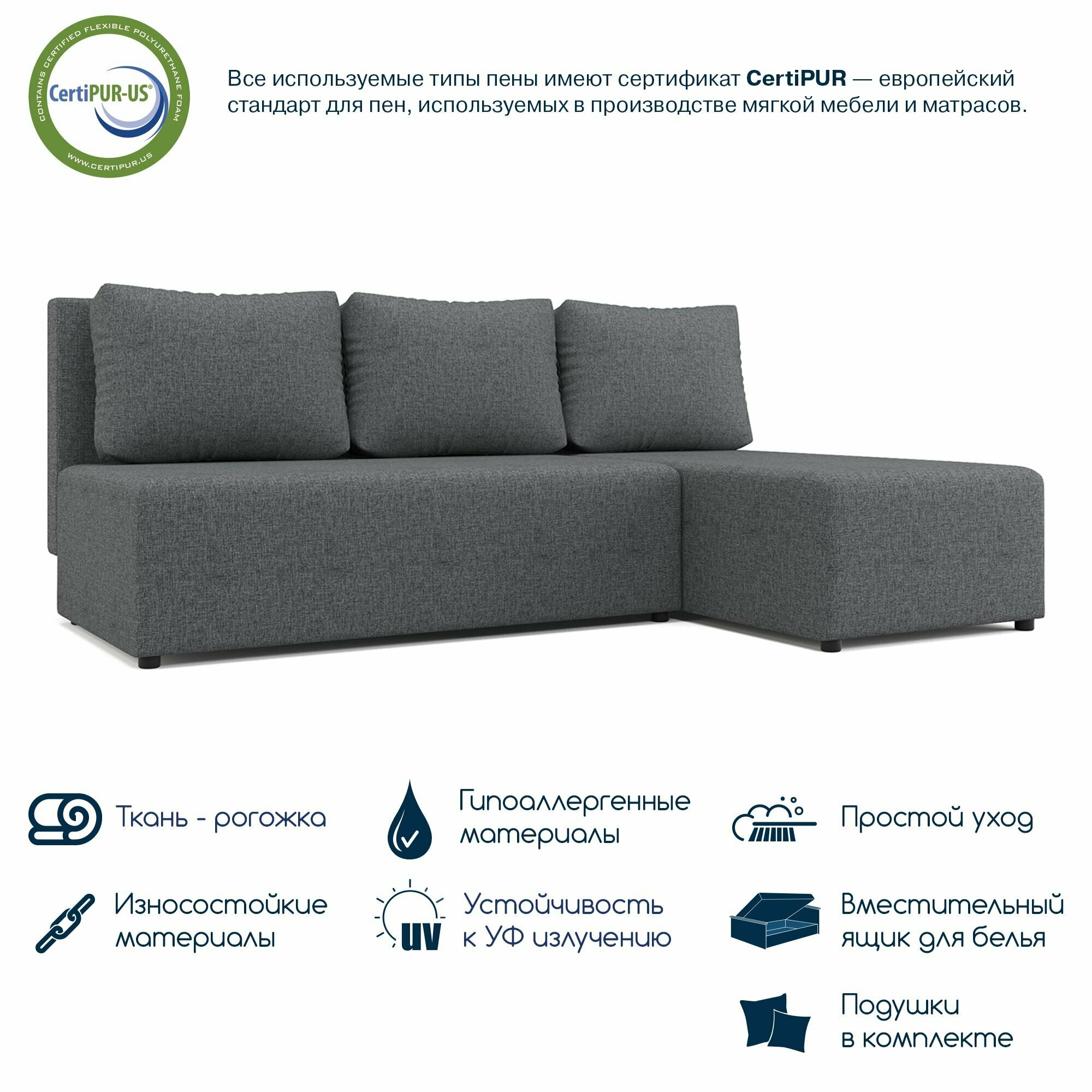 Угловой диван, диван-кровать в гостиную раскладной Beneli леон, серый, Рогожка, механизм Еврокнижка, 196х133х75см, 1шт информация: