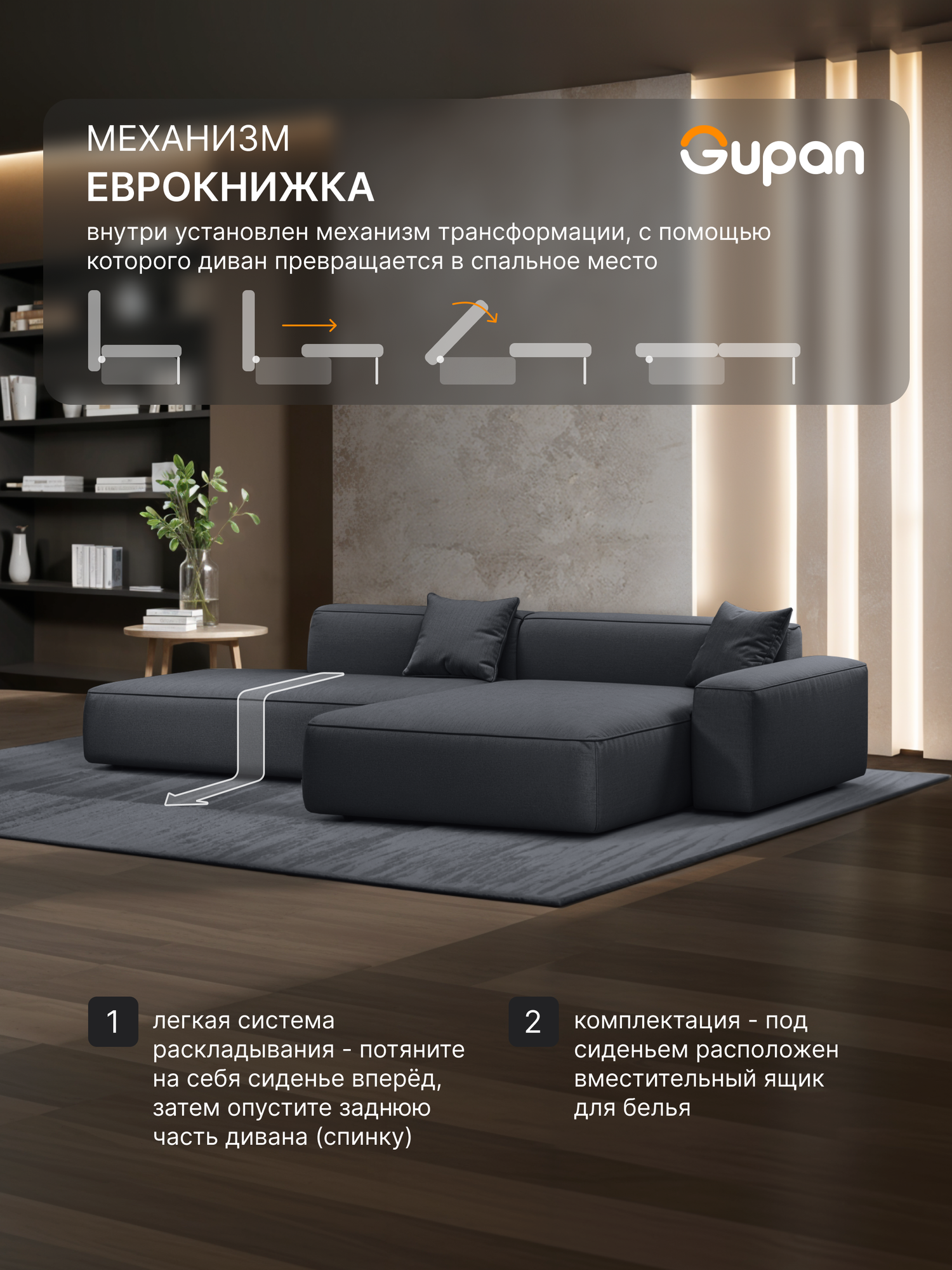 Отзывы на Диван угловой Gupan Flos Велюр Amigo Grafit, диван раскладной, механизм еврокнижка, беспружинный, с ящиком для белья, в гостиную, лофт