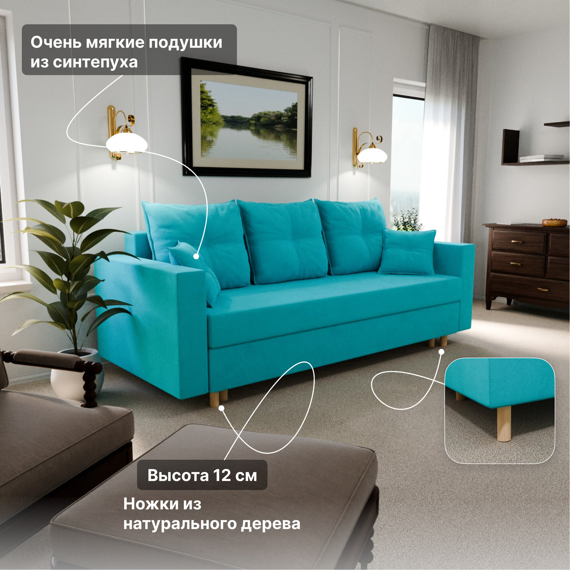 Диван, диван-кровать, диван раскладной "Гармония" ППУ, Велютта люкс 44, размеры 220х80х100, бирюзовый информация: