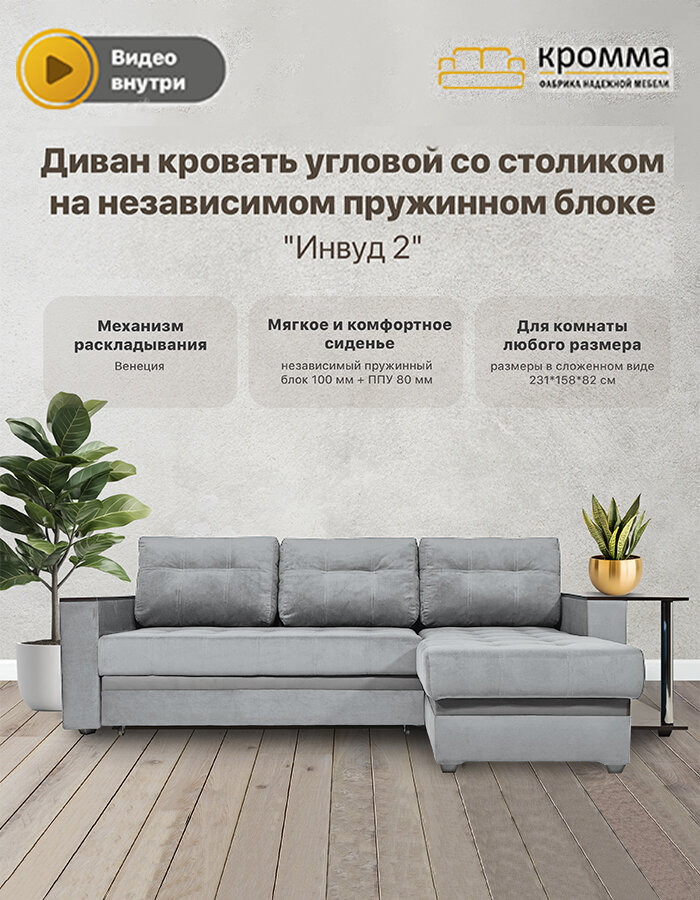 Отзывы на Кромма Диван Инвуд лайт 2 угловой со столом двухместный, Велюр, светло-серый/ Velutto 49