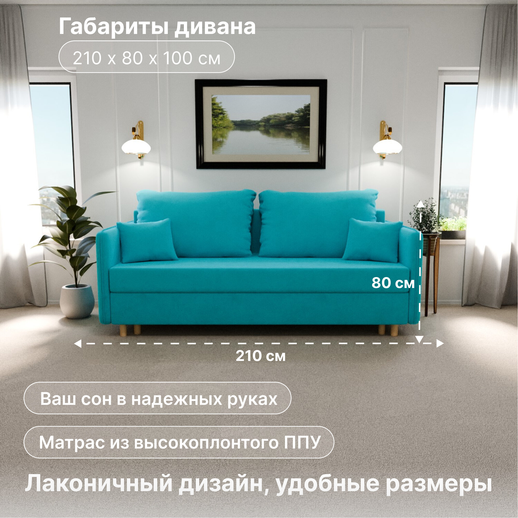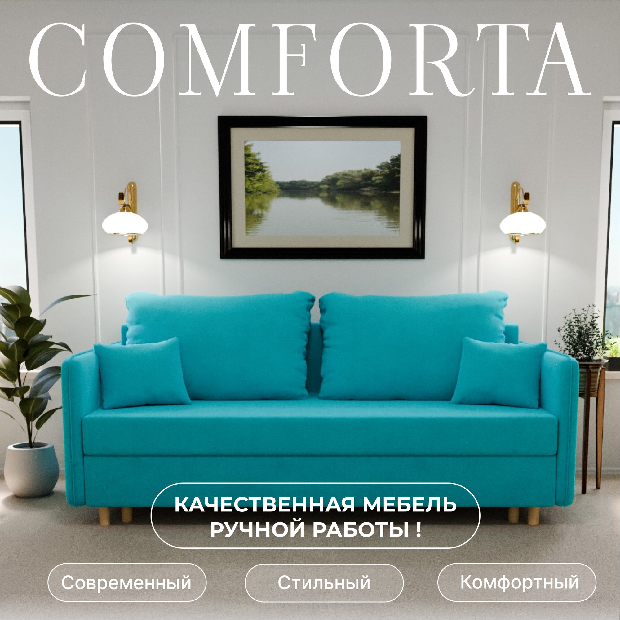 10 цен на Диван, диван-кровать, диван раскладной "Комфорта" ППУ, Велютта люкс 44, размеры 210х80х100, бирюзовый