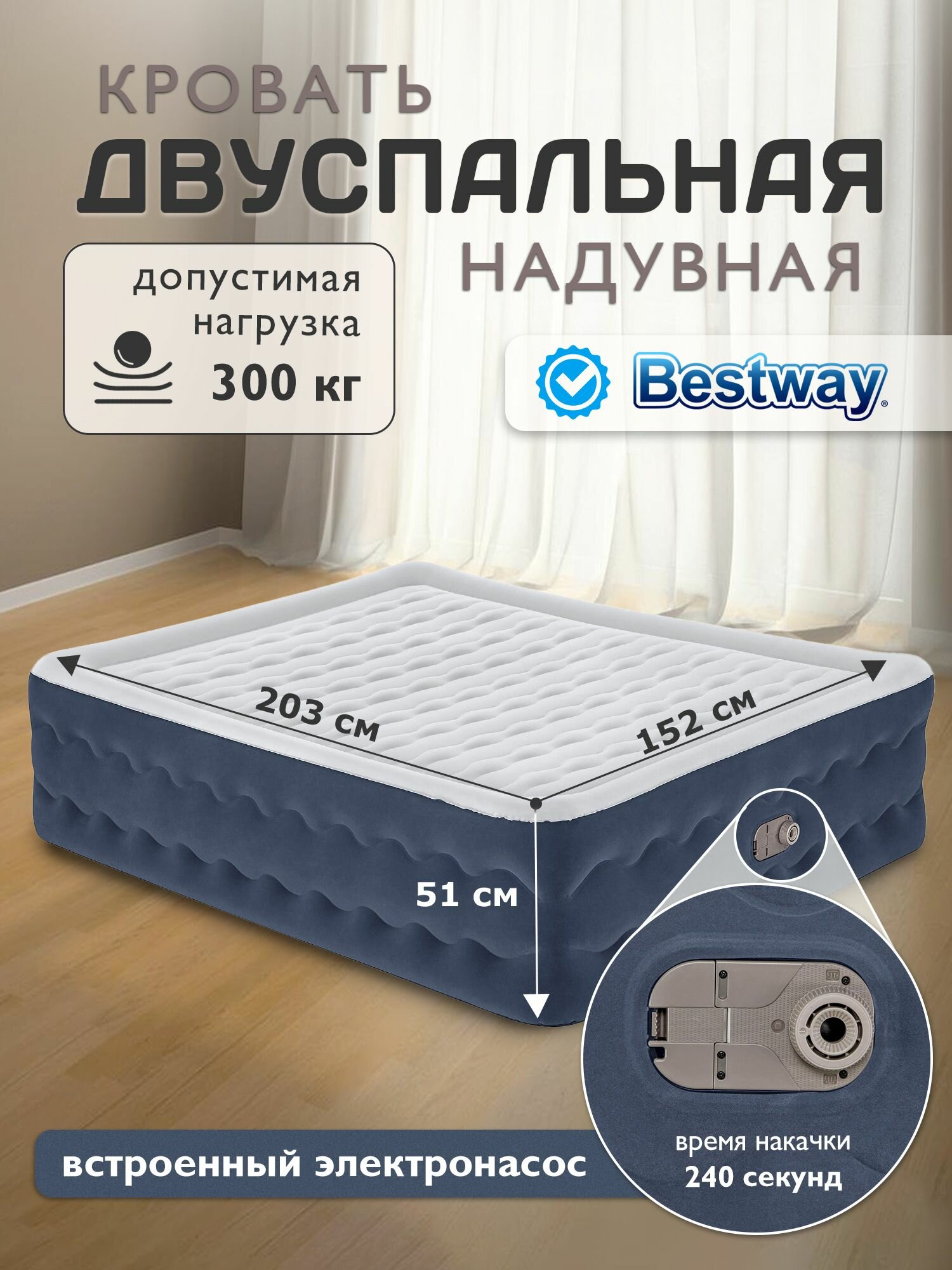 Кровать надувная двуспальная Bestway Tritech 6716P, с встроенным насосом, 152 см x 203 см x 51 см, до 300 кг информация: