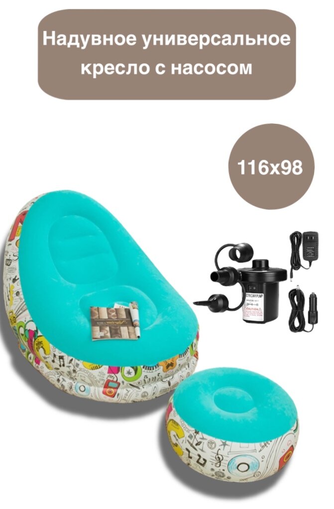 Отзывы на Надувное универсальное кресло с насосом, для дома и дачи, голубой с граффити, 116x98x83 см