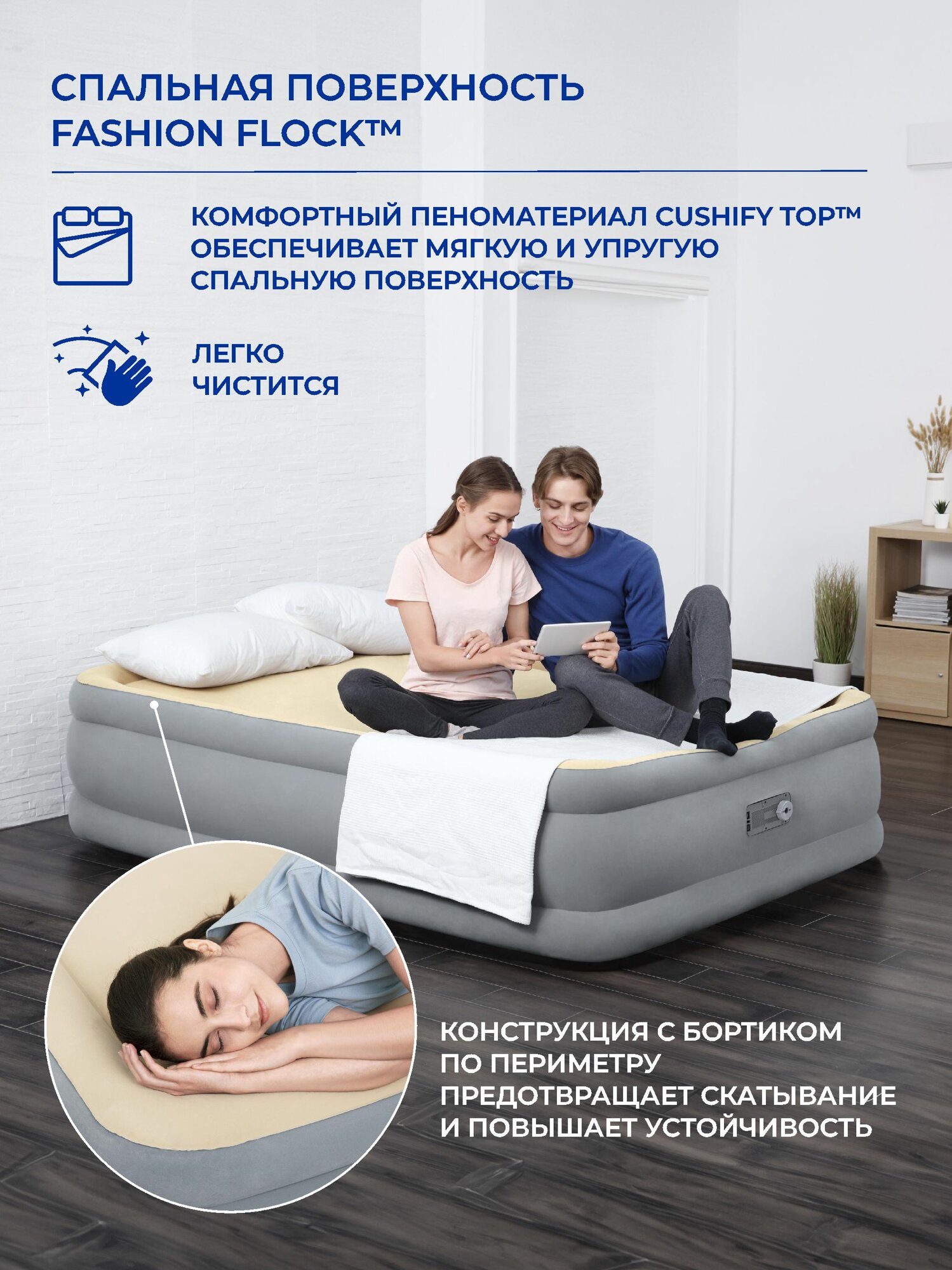 Матрас надувной двуспальный с мягким покрытием и встроенным электрическим насосом 203 х 152 х 46 см Bestway Quin (67486) информация:
